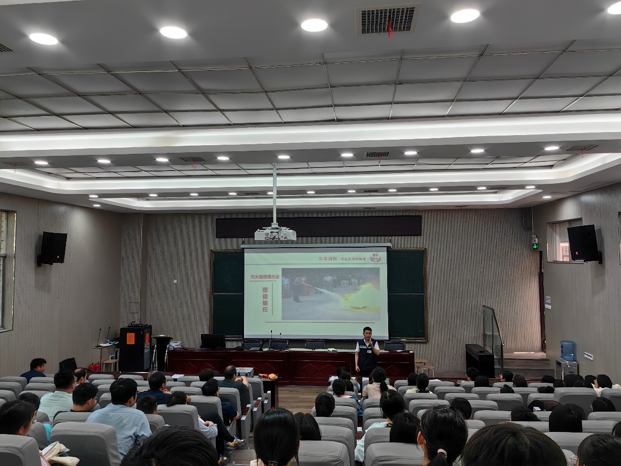 首先,师生们观看消防安全案例视频,触目惊心的火灾画面警醒大家要高度重视消防安全,切勿有侥幸心理。其次,安全宣传员着重讲解了火灾的危险性及防火措施;单位内消防设备的性能、灭火器的使用方法;扑救初起火灾以及自救逃生的知识和技能等;确保人员密集场所、重点防火单位的消防安全。安全宣传员从现代消防三要素和火灾的种类,面对不同类型的火灾如何灭火,如何逃生自救等问题进行消防科普。培训结束后,安全宣传员燃放烟雾弹并响起警笛声,师生们快速从报告厅撤离,弯腰并捂住口鼻,迅速有序地撤离到学院门前开阔地带。最后,在安全地带,安全宣传员详细讲述灭火器的正确使用方法并进行演示,学院师生进行实际操作演练,亲自体验现场灭火,掌握了灭火技能。