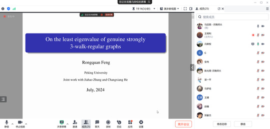 7月16日,应数学与信息科学学院邀请,北京大学博士生导师冯荣权教授在线为学院师生作题为“On the least eigenvalue of genuine strongly 3-walk-regular graphs”的学术报告,相关专业教师和硕士研究生30余人参加。 本次报告主要分为三个部分。第一部分,冯教授首先介绍图的相关概念,特别是强正则图,它是代数组合论的一个很重要的概念,接着介绍了强l-途径正则图,它是前者的一个推广。后来,E.R. van Dam和G.R. Omidi将强l-途径正则图分为五个图类,冯教授主要关注第五类图,即有四个互不相同特征值的连通正则图,也称之为真正l-途径正则图。第二部分冯教授介绍了真正强l-途径正则图关于特征值的若干结果。第三部分冯教授介绍了他们的主要结论:真正强3-途径正则图的最小特征值的上界是-2,并完全刻画了最小特征值取得-2时的所有图类。 报告结束后,冯教授对师生提出的相关问题进行了细致地回答。 专家简介: 冯荣权,北京大学数学科学学院教授、博士生导师。教育部高等学校大学数学课程教学指导委员会委员,“英才计划”数学学科工委会秘书长,中国数学会大学生数学竞赛工作组副组长,中国密码学会理事,中国运筹学会图论组合学分会常务理事。曾任国务院学位委员会第七届数学学科评议组秘书,中国数学会第十、十一届理事会理事,北京数学会秘书长。主要研究方向包括编码密码理论及代数组合论,曾先后主持或参加多项国家自然科学基金,国家863与973计划等,在国内外重要学术期刊等发表论文120余篇。