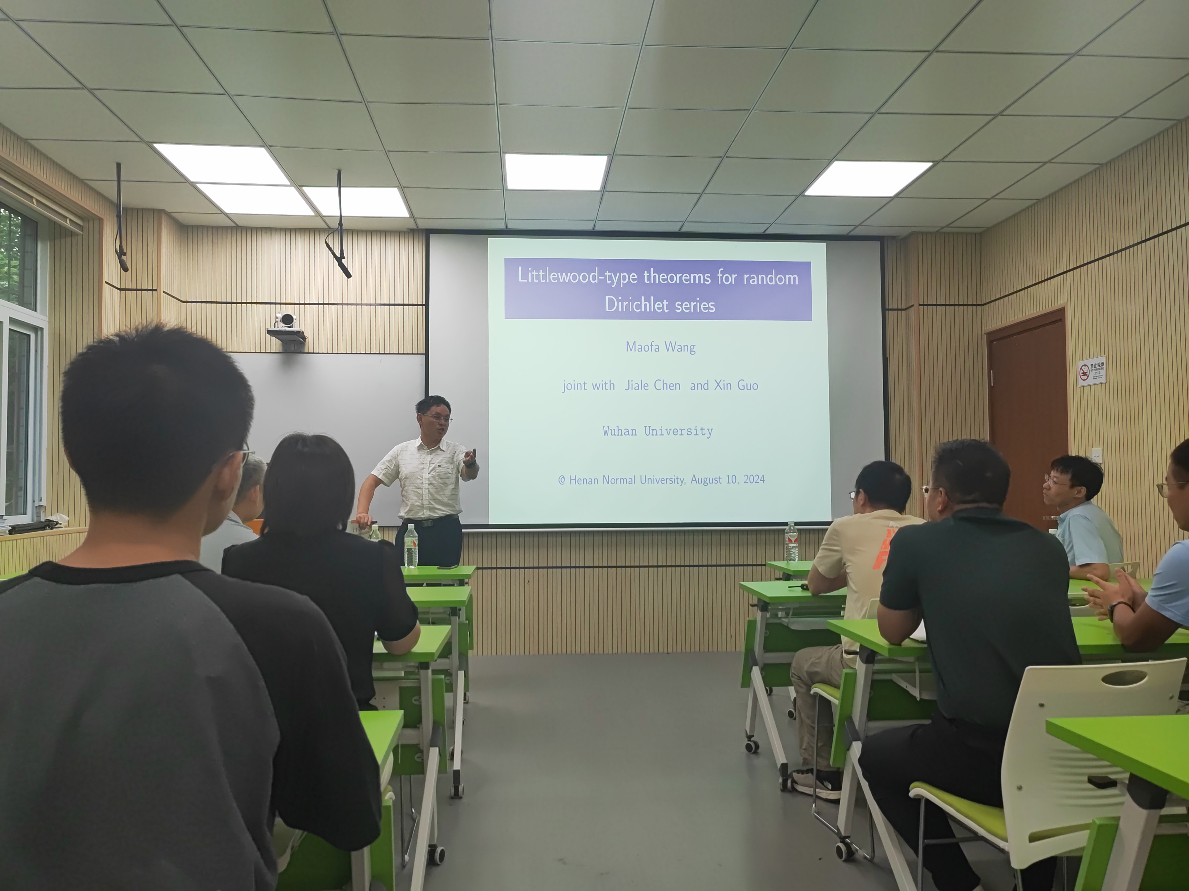 8月10日上午,应数学与信息科学学院邀请,武汉大学王茂发教授为学院师生作题为“Littlewood-type theorems for random Dirichlet series”的学术报告,相关专业教师和研究生40余人参加了此次报告。本次报告由院长左红亮教授主持。 在本次报告中,王茂发教授首先对一些必要的概念作了阐明,并向大家介绍了经典的Littlewood定理。随后,王老师对这一论题的研究历史和背景做了详细的讲授。最后,王老师给大家分享了他们团队在该论题上的研究成果及其应用。 王老师的报告循序渐进,讲解深入浅出,使师生们对分析中经典结果的随机化有了初步感受,对Littlewood型问题的研究有了一定的认识,并对其研究方法和技巧也有了初步的了解,使大家受益匪浅。 报告结束后,王老师与大家进行了多方面的深入交流并耐心地回答了师生的问题。本次报告内容丰富,也展现了Littlewood型问题的研究进展和相关的热点问题,使在场的师生收获颇丰。 专家简介: 王茂发,武汉大学数学与统计学院教授、博士生导师。主要研究方向是泛函分析及其应用,在Sci. China Math., J. Funct. Anal., J. Operator Theory, Math. Z., Math. Nachr., Indiana Univ. Math. J.等知名期刊上发表学术论文百余篇,相关成果得到了国内外同行专家的充分肯定和积极评价,多次受邀到欧美等国家和地区进行学术交流与访问。 (数学与信息科学学院 尹际富) |