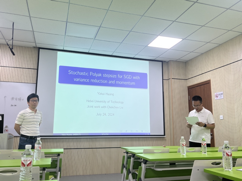 7月24日下午,应数学与信息科学学院邀请,河北工业大学黄亚魁教授作了题为《Stochastic Polyak step size for SGD with variance reduction and momentum》的专题报告。报告由数学与信息科学学院裴永刚副院长主持。学院相关研究方向的青年教师和研究生参加了此次报告。 报告主要关注梯度类算法,步长是影响随机梯度下降(SGD)方法收敛性和效率的关键因素。随机Polyak步长(SPS)在机器学习问题中显示出巨大的潜力。在此次讲座中,黄亚魁教授介绍了一种新的SPS的变体,它是由原始目标函数与方差缩减技术和动量相结合构造的随机函数的最小值的下界来计算的,它适用于非插值问题。基于所提出的步长和SGD,开发了一种算法SPSVRM,该算法以亚线性速率收敛于凸和非内插问题的精确解。数值实验表明,SPSVRM的性能优于其他具有最新SPS变体的SGDs。黄亚魁教授的讲座给了与会师生很多思考和启发,使与会青年教师和研究生受益匪浅。 讲座结束后,黄亚魁教授对与会师生提出的问题进行详细解答,并在优化问题方面展开了热烈的交流讨论。 专家简介: 黄亚魁,河北工业大学准聘教授、硕士生导师。2015年博士毕业于西安电子科技大学,2015年7月至2017年5月在中国科学院数学与系统科学研究院从事博士后研究。主要研究兴趣包括梯度类算法理论及应用、大规模机器学习和分布式优化等领域的一阶算法,相关成果发表在SIAM Journal on Optimization、Journal of Scientific Computing、Computational Optimization and Applications等期刊,主持国家自然科学基金、河北省自然科学基金、中国博士后基金等科研项目。现任中国运筹学会数学规划分会理事、算法软件与应用分会常务理事,中国数学会计算数学分会理事,河北省运筹学会秘书长。 (数学与信息科学学院 郭静邑 裴永刚) |