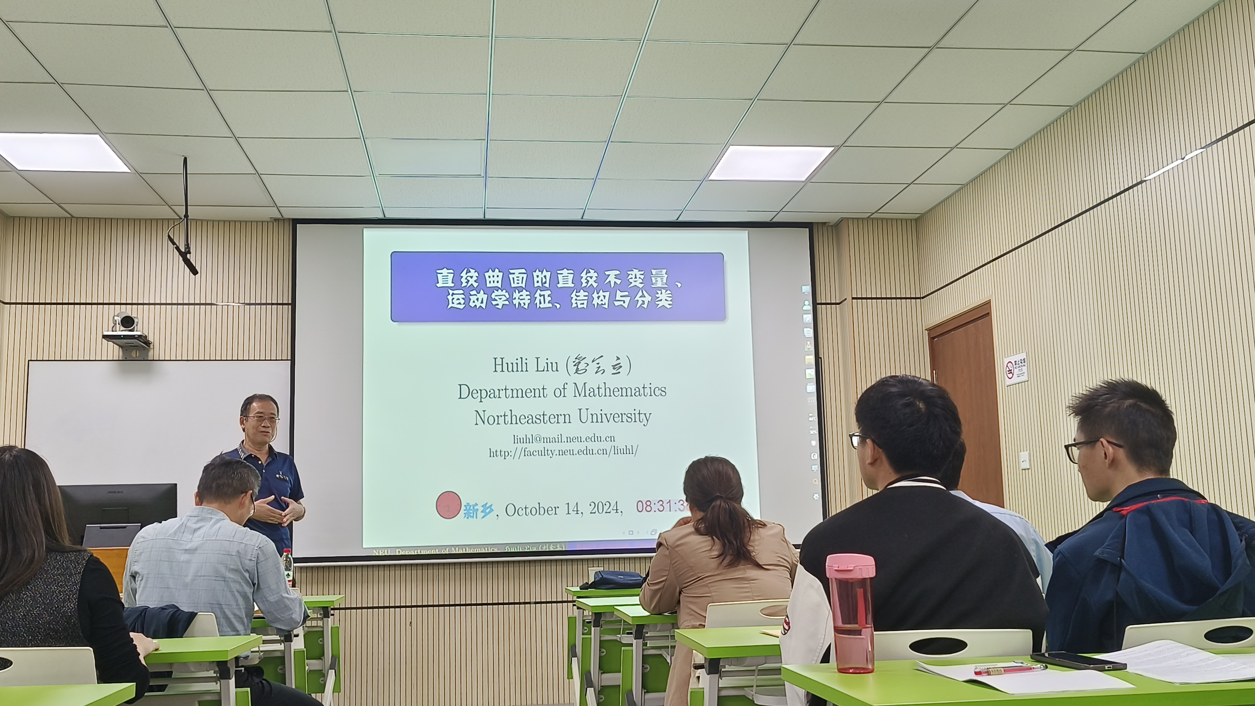 10月14日上午,应数学与信息科学学院邀请,东北大学刘会立教授为学院师生作题为“直纹曲面的直纹不变量、运动学特征、结构与分类”的学术讲座,学院相关学科教师及研究生30余人共同聆听了本次讲座。 刘教授首先回顾了微分几何中一些经典曲线如螺线、Mannheim曲线及一些典型直纹面如切线曲面、主法线曲面、副法线曲面的性质和特点。如何刻画分类直纹面是微分几何中的一个有趣而基本的问题。针对这个基本问题,刘会立教授利用直线运动速度、旋转角速度、加速度等运动学观点引入一些直纹不变量描述刻画这些直纹面,并详细讲解了三维欧式空间中的直纹面的分类定理。最后刘教授还讲解这些理论在生物遗传学和计算机理论中的应用。 刘会立教授的报告紧扣前沿,开阔了在场学生的学术视野,提升了同学们的科研品味。讲座结束后,刘会立教授与在场师生进行交流互动,现场气氛热烈,学院师生受益匪浅。 专家简介: 刘会立,教授,博士生导师,德国柏林工业大学理学博士。国内外学术期刊发表论文百余篇。曾获教育部“资助优秀年轻教师基金”资助(1999);国务院政府特殊津贴(2005)。完成多项国家自然科学基金面上项目和国际合作项目。主要从事微分几何与应用、信息与计算、几何生物学等相关问题的研究。 (数学与信息科学学院 许瑞伟 李智)