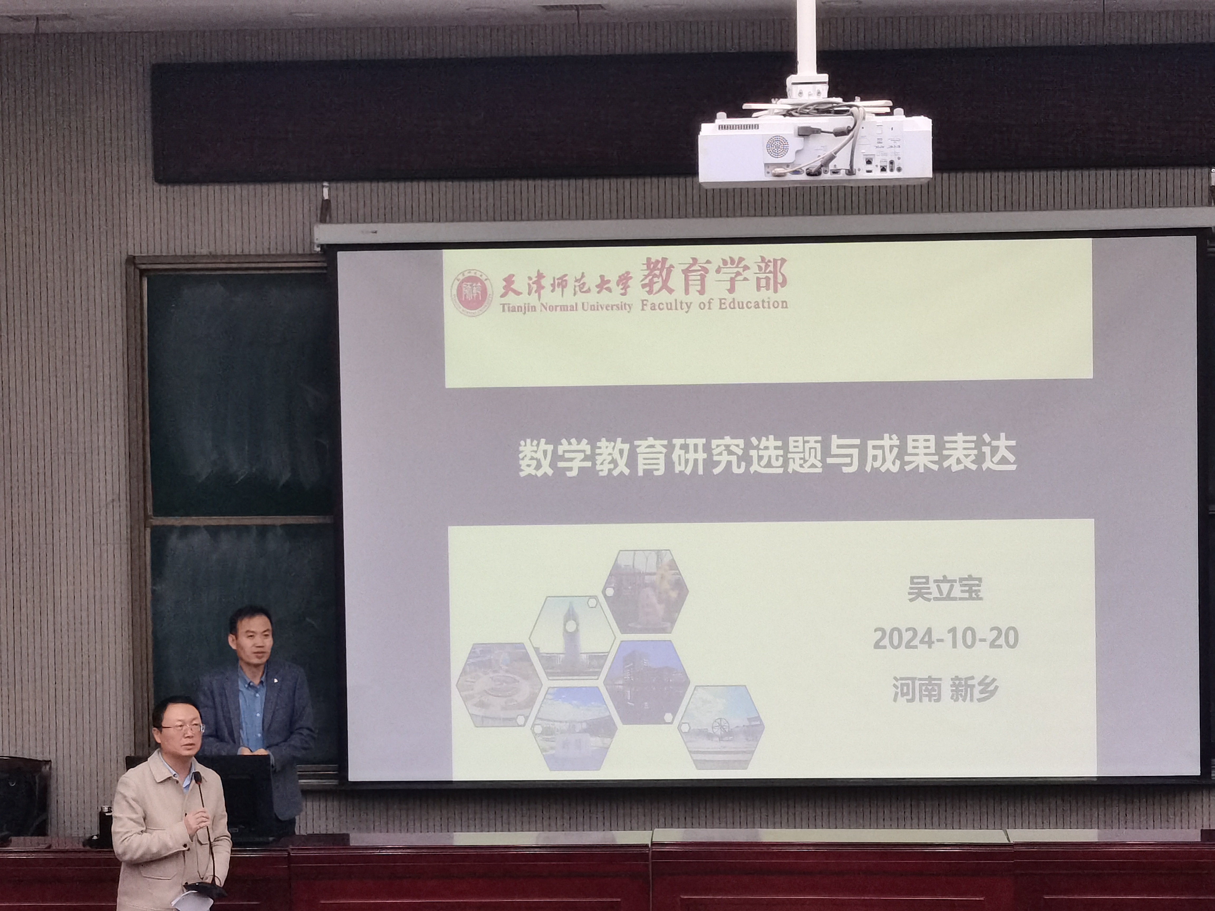 10月20日下午,应数学与信息科学学院邀请,天津师范大学吴立宝教授为学院师生作题为“数学教育研究选题与成果表达”的学术报告。学院教师及学科教学(数学)专业研究生聆听了此次报告。报告由数学与信息科学学院王振平副教授主持。 在此次报告中,吴立宝教授从导语、选题框架、文献综述及论文写作四个部分展开。吴立宝教授指出,选题的意义在于发现,选择问题是研究活动的起点。而教育研究问题的来源主要是紧随课题的指南立项结项公示、紧跟国内外数学教育研究大会、紧追数学教育专家的相关研究、紧盯重要报刊的重点选题计划、紧靠教育与心理学的基本理论、紧切小学数学教师的教学实践、紧贴学校与家长关注焦点问题、紧扣当下小学生数学学习现状、紧记教育教研人员的初始使命。在文献综述部分,吴立宝教授指出研究方法是决定数学教育研究质量的关键因素,并简要介绍常用的教育研究方法。最后,吴立宝教授对学术论文基本结构进行说明。 报告结束后,吴立宝教授与师生进行交流,解答学生提出的问题。本次报告内容丰富,学院师生受益匪浅。 专家简介: 吴立宝,北京师范大学教育学博士,天津师范大学教授,博士生导师,主要从事数学教育与教师教育研究。教育部“国培计划”专家,教育部课程教材研究所兼职研究员,义务教育数学课程标准实验项目组副组长。基础教育国家级教学成果一二等奖各1项,主持1项国家社会科学基金课题,主研3项国家社会科学基金重点课题,主持5项省部级课题(其中重点1项)。出版1部专著,编著《中学数学教学设计》等8部,在《课程·教材·教法》《中国教育学刊》《教育学报》等发表180余篇论文,其中核心95篇,人大复印报刊资料全文转载22篇,索引116篇。 (数学与信息科学学院 魏佳璐) |
