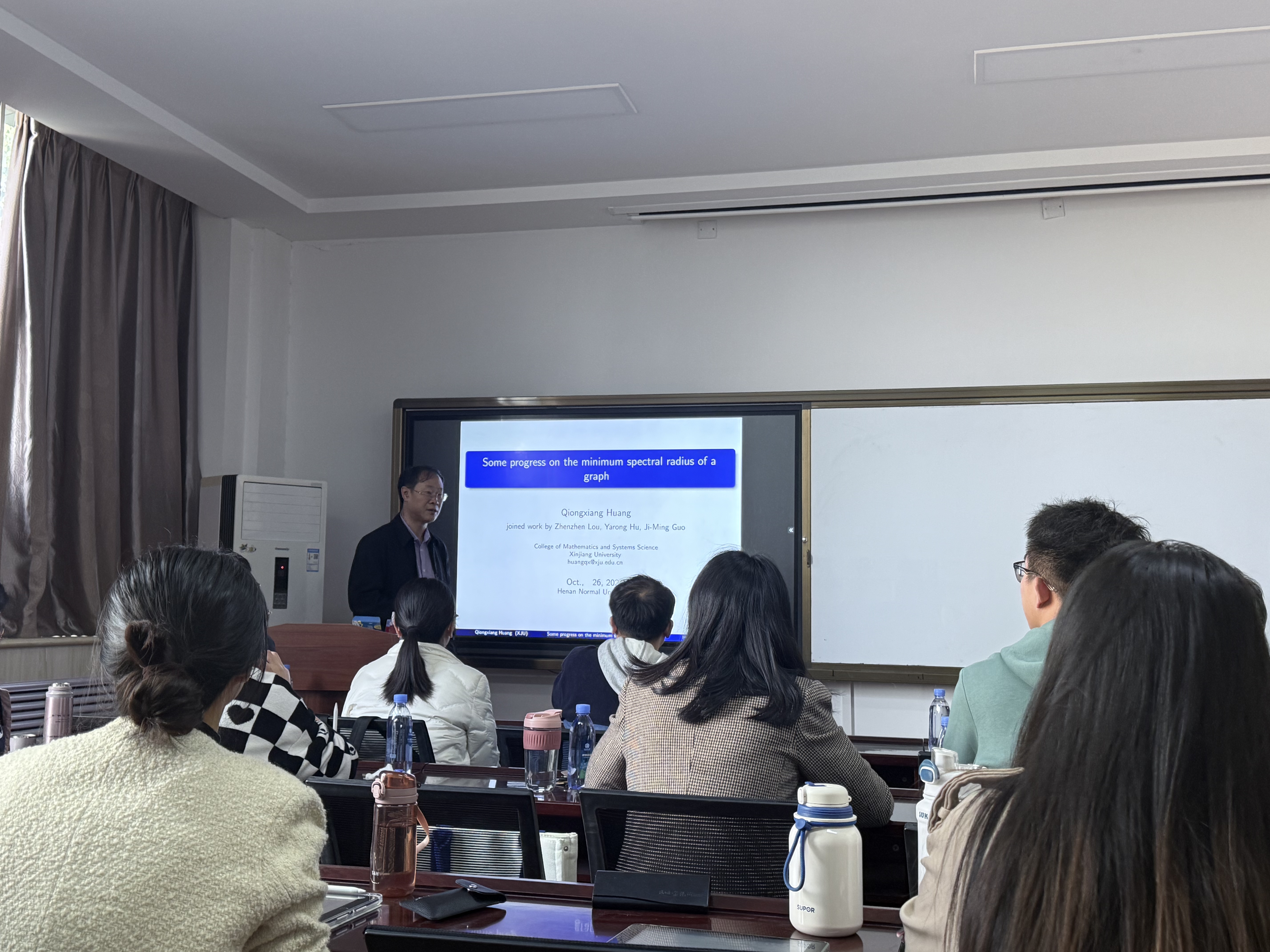 10月25日, 应数学与信息科学学院邀请,新疆大学博士生导师黄琼湘教授为学院师生作题为“Some progress on the minimum spectral radius of a graph”的学术报告,相关专业教师和硕士研究生30余人参加此次报告。 本次报告主要介绍了图的最小谱半径的相关问题。黄琼湘教授首先介绍了最小谱半径问题的研究背景;其次黄教授分别从给定直径,给定控制数,给定顶点数与边数等方面介绍了该问题的研究进展;最后,黄教授介绍了自己的研究结果,即给定独立数时最小谱半径的相关结果并介绍了证明过程中用到的主要工具与方法。 报告结束后,黄教授对师生提出的相关问题进行了细致地回答。 专家简介: 黄琼湘,新疆大学教授、博士生导师,主要研究领域为图论、代数图论、图谱理论。在J. Combin. Theory Ser. B、Europ. J. Combin.、J. Algebraic Combin.、Electronic. J. Combin.、Discrete Math.、Discrete Appl. Math.、Linear Algebra Appl. 等图与组合领域的期刊上发表论文150余篇;主持完成国家自然科学基金项目多项,作为子课题负责人承担国家自然科学基金重点项目1项;荣获新疆维吾尔自治区科技进步奖等。 (数学与信息科学学院 赵树丽) |