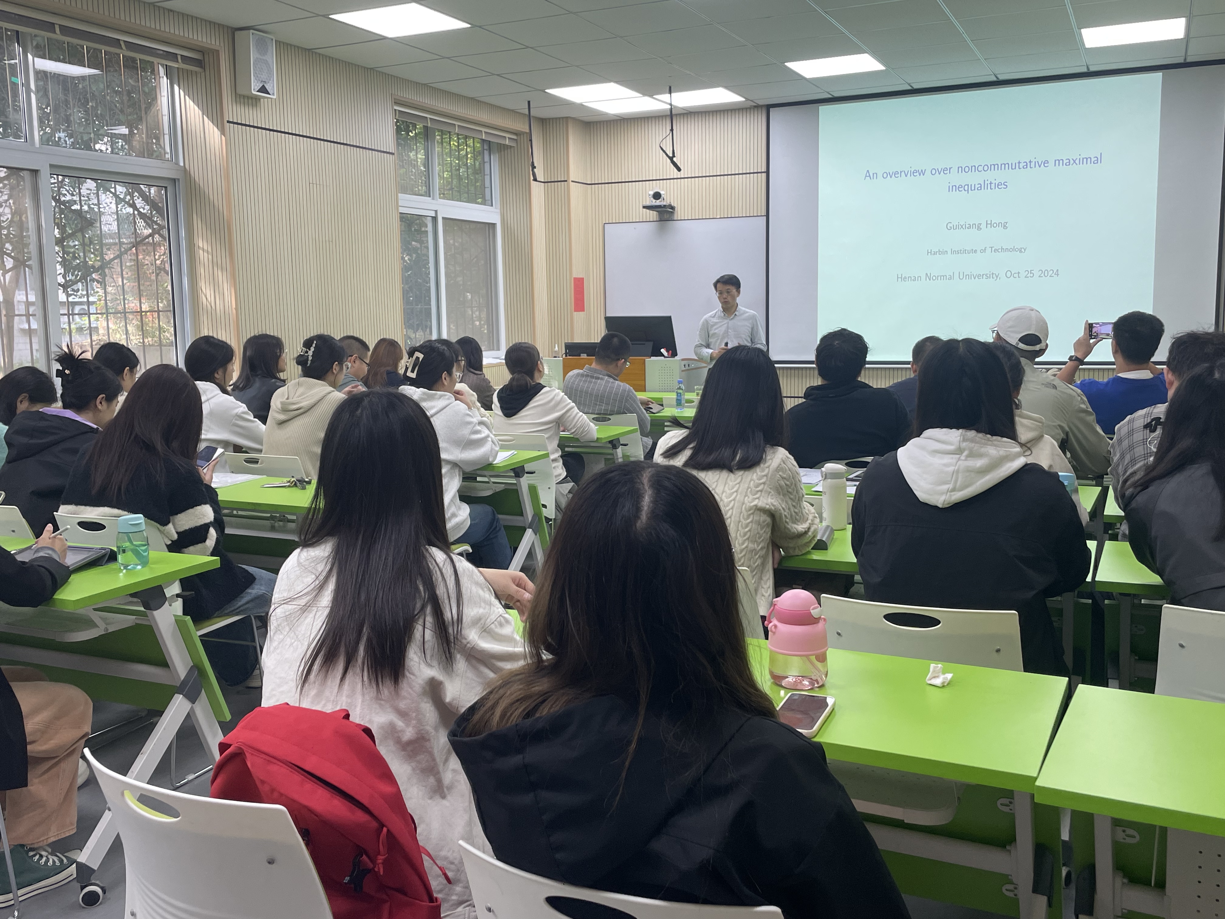 10月25日上午,应数学与信息科学学院邀请,国家杰出青年科学基金获得者、哈尔滨工业大学洪桂祥教授为学院师生作题为“An overview over noncommutative maximal inequalities’’的学术报告,相关专业教师和研究生50余人参加此次报告。报告会由学院副院长高福根教授主持。 报告中,洪教授首先介绍了经典的极大不等式——Hardy-Littlewood极大不等式、Birkhoff ’s ergodic极大不等式和Doob’s极大不等式。紧接着,详细讲解了非交换情形下的相关不等式一些强弱版本。最后,洪教授耐心细致地回答了师生提出的问题。 本次报告会内容丰富,讨论热烈,洪教授传授了一些做学问的思想方法,师生受益匪浅,收获满满,加深了对科研的兴趣。 专家简介: 洪桂祥,哈尔滨工业大学教授,2016年入选国家高层次人才青年计划,2023年获批国家杰出青年科学基金项目。主要研究调和分析、非交换分析及其在非交换几何与量子信息中的应用,为这一新兴领域的建立与发展做出卓越贡献,在Duke Math. J., Memoirs AMS, Adv. Math, CMP, PTRF和Math. Ann.等杂志上发表成果30余篇,被Wolf奖获得主Elias M. Stein、非交换鞅论奠基人许全华教授、Marius Junge、Tuomas Hytönen、澳大利亚科学院院士Fedor Sukochev等人多次引用并评价为 “突破”、“开创性工作”、“真正巨大的贡献”等。 (数学与信息科学学院 张倩)