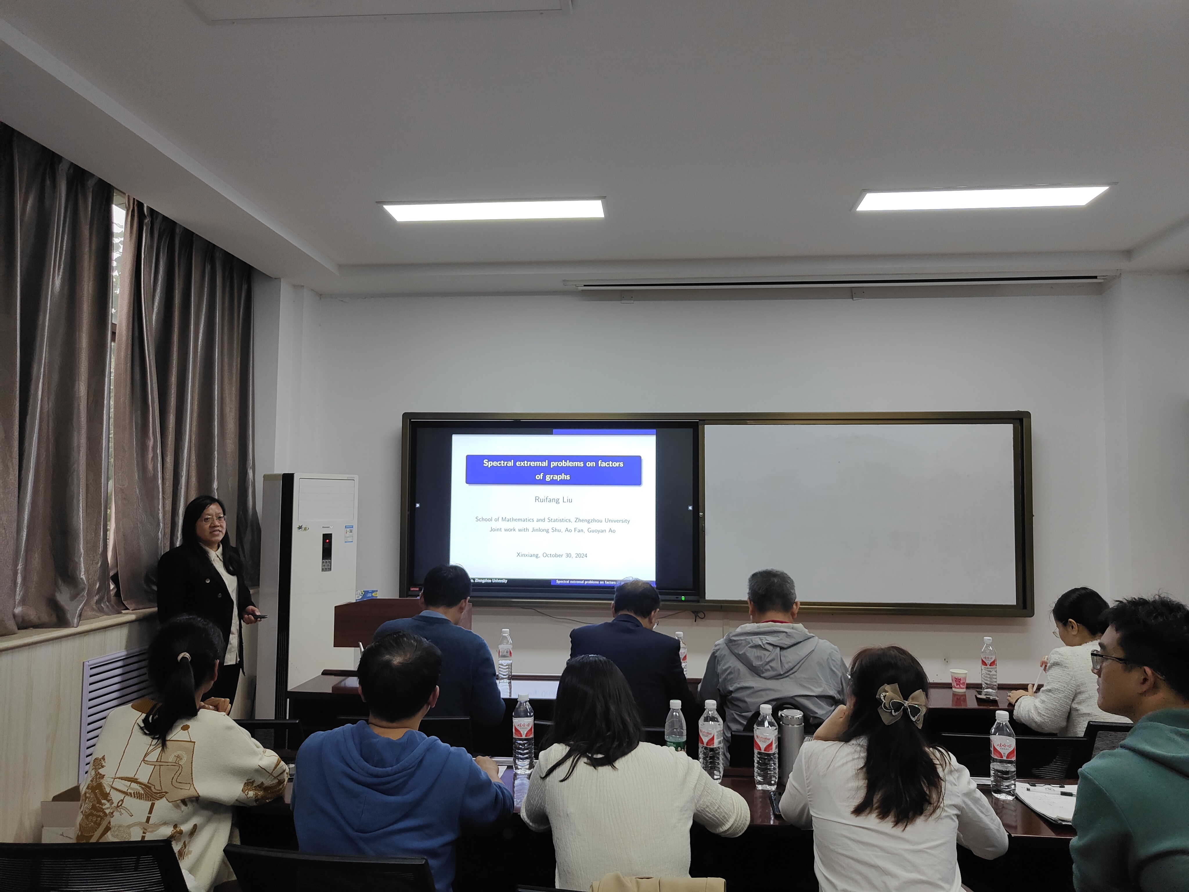 10月30日,应数学与信息科学学院的邀请,郑州大学博士生导师刘瑞芳教授为学院师生作题为“Spectral radius and the existence of factors in graphs”的学术报告,相关专业教师和硕士研究生20余人参加此次报告。 本次报告主要介绍了谱半径与图的因子存在性的相关研究。刘瑞芳教授首先介绍了谱半径和图的因子的概念,从而引出谱半径与图中因子存在性的关系以及不包含特殊图因子的谱极值图的刻画。接着,刘教授详解介绍了研究该类问题的相关理论和工具,以及最新研究结果。 刘瑞芳教授的报告深入浅出,与会师生听的兴趣盎然,受益匪浅。报告结束后,刘瑞芳教授对师生提出的相关问题进行了细致地回答。 专家简介: 刘瑞芳,郑州大学数学与统计学院教授,博士生导师。2010年博士毕业于华东师范大学。河南省杰青,河南省高层次人才,河南省教育厅学术技术带头人,河南省高等学校青年骨干教师。中国工业与应用数学学会图论组合及应用专业委员会委员,河南省运筹学会常务理事,主要从事图谱理论和谱极值图论方面的研究工作。在《Electron. J. Combin.》、《Adv. Appl. Math.》、《Discrete Math.》、《Discrete Appl. Math.》、《Linear Algebra Appl.》等图论主流期刊发表SCI学术论文50余篇。主持国家自然科学基金项目3项,河南省杰青1项。曾在美国西弗吉尼亚大学数学系和香港浸会大学数学系进行学术访问。 (数学与信息科学学院 王婧) |
