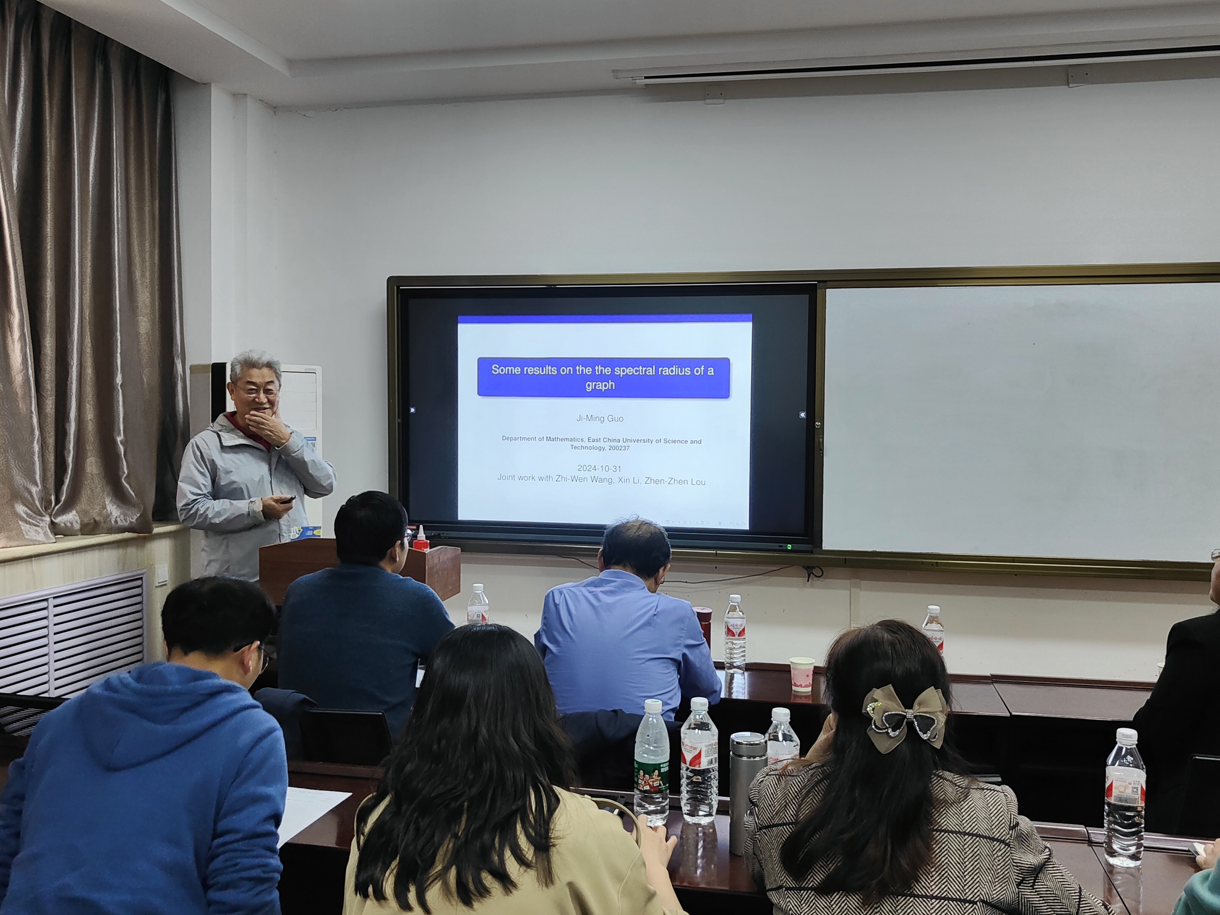 10月30日,应数学与信息科学学院的邀请,华东理工大学博士生导师郭继明教授为学院师生作题为“Some results on the spectral redius of a graph”的学术报告,相关专业教师和硕士研究生20余人参加此次报告。 本次报告主要介绍了谱半径的相关研究。郭继明教授首先介绍了谱半径的概念。接着,郭教授详细介绍了关于度条件的谱半径的界、两个图运算的谱半径和给定独立数的谱半径。最后介绍了若干公开问题。郭继明教授的报告深入浅出,与会师生受益匪浅。报告结束后,郭继明教授对师生提出的相关问题进行了细致地解答。 专家简介: 郭继明,华东理工大学理学院数学系教授,博士生导师,上海市数学会常务理事、中国工业与应用数学学会理事。主要研究方向为图论与组合数学,先后主持多项国家自然科学基金面上项目,出版学术专著一部,在《Journal of Graph Theory》、《Discrete Mathematics》、《Linear Algebra and Its Applications》、《Discrete Applied Mathematics》、《Linear and Multilinear Algebra》、《Graphs and Combinatorics》、《中国科学》等国内外专业期刊上发表论文90余篇。 (数学与信息科学学院 王婧) |