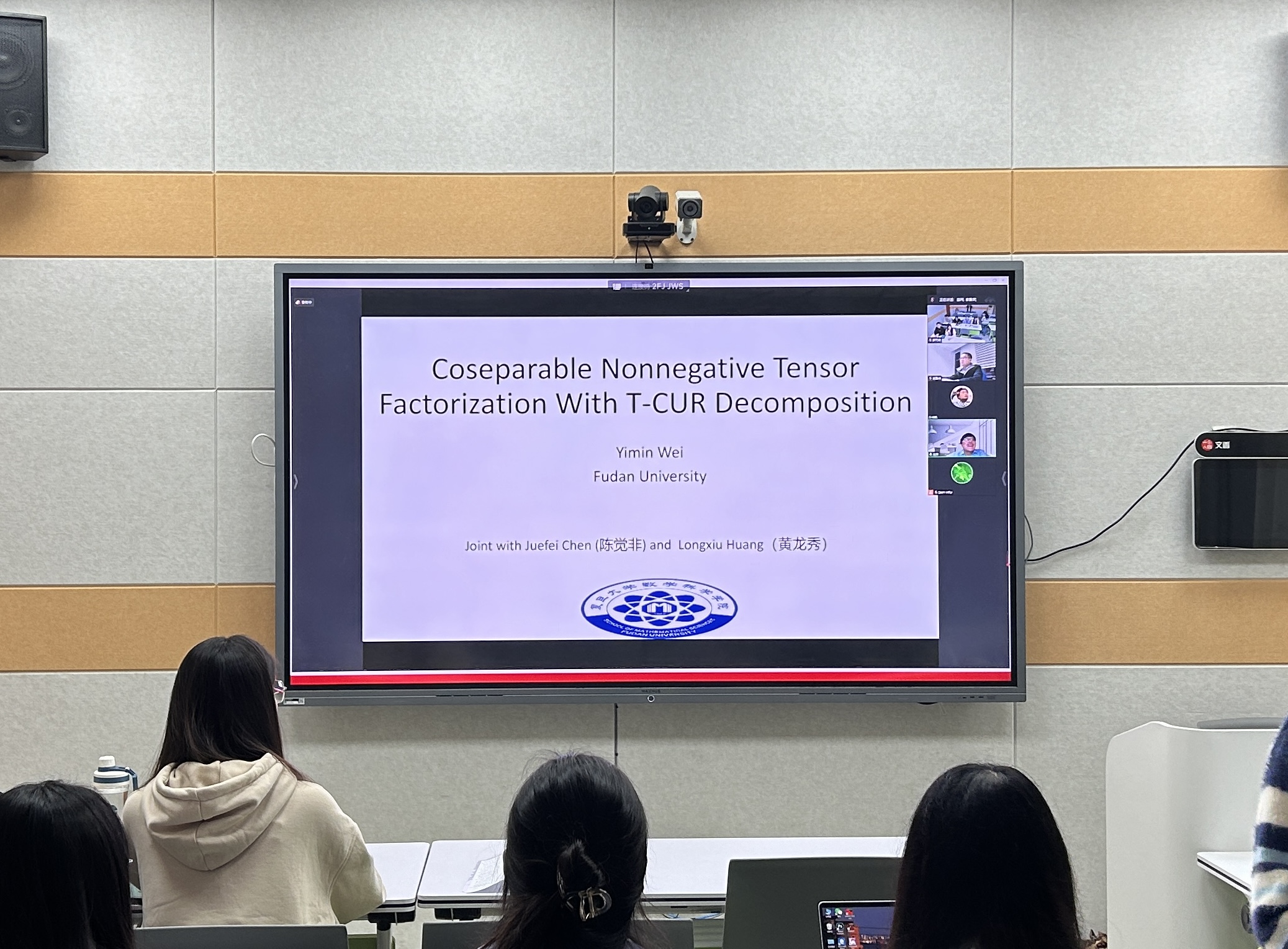 10月31日,应数学与信息科学学院邀请,复旦大学数学科学院教授、博士生导师魏益民教授做客数学与信息科学学院“牧野格致”为学院师生作题为“COSEPARABLE NONNEGATIVE TENSOR FACTORIZATION WITH T-CUR DECOMPOSITION”的学术报告,相关专业教师和研究生30余人参加了此次报告。报告由数学与信息科学学院崔鲁宾教授主持。 在本次报告中,魏益民教授首先从非负矩阵分解开始介绍,非负矩阵分解(NMF)是一种重要的无监督学习方法,用于从数据中提取有意义的特征。然而,在现实世界中,数据更自然地表示为多维数组,如图像或视频。NMF在高维数据中的应用涉及矢量化,这有可能失去基本的多维相关性。为了保持这些固有的相关性,转向张量(多维数组)并利用张量t积创建了非负张量因式分解(NTF)。紧接着,魏益民教授验证了t-CUR抽样理论,并将其与张量离散经验插值方法(t-DEIM)相结合,引入了一种替代的随机指数选择过程,并在面部分析数据集上进行了测试得到了优异的结果。 报告结束后,魏益民教授与参会师生进行了互动,对学生老师的提问进行了积极的回答,并给出了未来发展的方向,就研究生的学习给出了建设性的建议。本次报告内容丰富,现场气氛热烈,给了与会师生很多思考和启发,使与会教师和研究生受益匪浅。 专家简介: 魏益民,复旦大学数学科学院教授、博士生导师。主要从事矩阵、张量方面的理论和应用研究,多次主持国家自然科学基金面上项目、教育部博士点基金项目和973子课题等项目,获得上海市科学技术奖二等奖。担任国际学术期刊Computational and Applied Mathematics,Journal of Applied Mathematics and Computing,FILOMAT,《高校计算数学学报》的编委。在国际学术期刊Math. Comput.,SIAM J. Sci. Comput.,SIAM J. Numer Anal.,SIAM J. Matrix Anal. Appl.,IEEE Trans. Auto. Control,IEEE Trans. Neural Network Learn. System,Neurocomputing和Neural Computation等发表论文150余篇;在EDP Science,Elsevier,Springer,World Scientific和科学出版社等出版英语专著5本。5次入选爱思唯尔“中国高被引学者”榜单。 (数学与信息科学学院 郭贵良 崔鲁宾) |