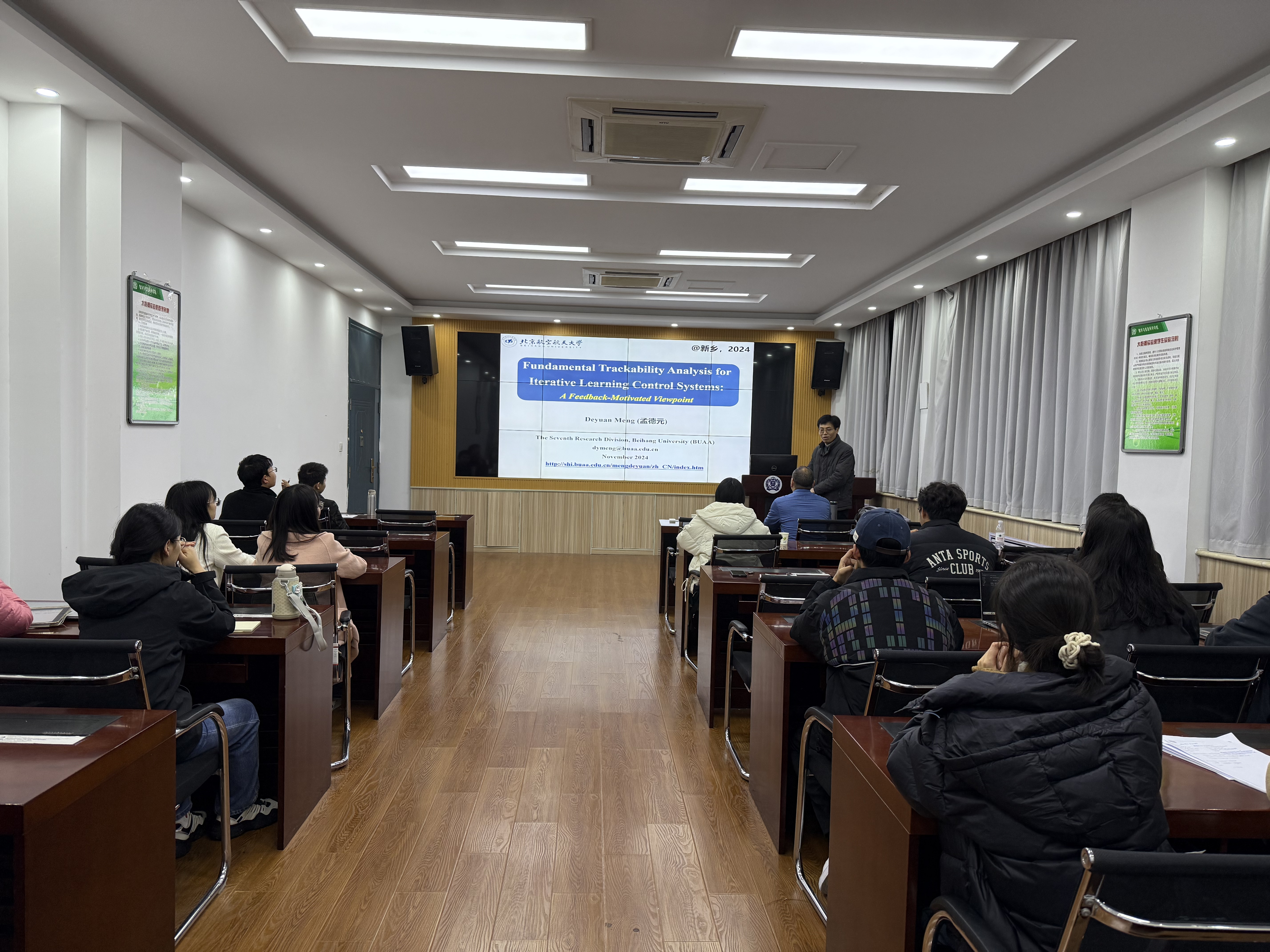 11月15日,应数学与统计学院邀请,北京航空航天大学孟德元教授做客“牧野格致”讲堂为学院师生作题为“Fundamental Trackability Analysis for Iterative Learning Control Systems”的学术报告,数学与统计学院师生共二十余人参加此次报告。报告由数学与统计学院李钧涛主持。 孟德元教授深入阐述了迭代学习控制(ILC)系统的背景,并重点探讨了ILC的一些基本问题。在此基础上,他提出了若干基于反馈的ILC设计与分析方法,以拓展ILC的应用范围。首先,他研究了ILC的可跟踪性特性,旨在揭示完美跟踪任务的可实施性。通过探讨可跟踪性与可控性的等价关系,引入了状态反馈设计思路,制定出实现完美跟踪的ILC更新法则。 随后,孟教授通过将完美跟踪问题与状态观测问题关联起来,进一步利用观测器设计思路,探索了另一种ILC更新法则。依据该法则,不仅可以实现完美跟踪任务,还能直接揭示ILC系统的可学习特性。这两种基于反馈的ILC更新法则适用于任何线性ILC系统,并且在某些特定设计条件下,能够确保其在有限次迭代后收敛。 最后,孟教授提出了一种在控制与数学之间建立双向关系的途径。例如,基于反馈的ILC方法被用于开发一些线性代数方程的迭代求解方法。这种方法展示了ILC在控制理论与数学方法中的广泛应用潜力。报告结束后,孟教授就数据驱动迭代学习控制的发展前景等相关问题与台下师生展开深入的讨论和交流。孟教授的报告内容丰富,使参会师生对数据驱动迭代学习控制理论有了深刻的认识。 专家简介: 孟德元,北京航空航天大学自动化科学与电器工程学院教授,博士生导师、国家优秀青年科学基金获得者。主要研究方向为数据驱动控制、学习与自适应控制、网络系统控制等。在IEEE TAC、Automatica等国际知名期刊发表SCI论文100余篇。担任中国自动化学会数据驱动控制、学习与优化专业委员会委员、副秘书长,International Journal of Systems Science、International Journal of Control, Automation, and Systems等期刊的Associate Editor。 (数学与统计学院 沈志萍) |