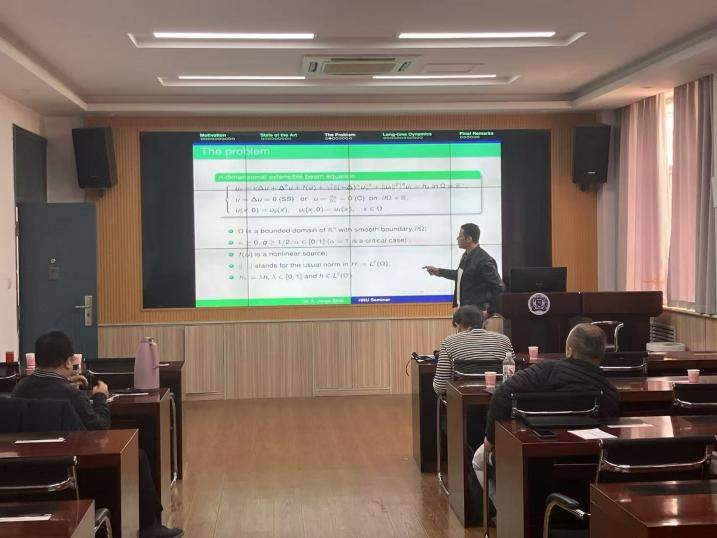 12月24日,应数学与统计学院的邀请,巴西隆德里纳州立大学Marcio Antonio Jorge da Silva教授在数学北楼506教室为我院师生作题为“A class of beam equations with nonlocal damping: Kolmogorov ε-entropy estimates” 的学术报告。数学与统计学院师生共三十余人参加此次报告。本次报告由杨新光教授主持。 Marcio 教授首先介绍了一类带有非局部阻尼的梁方程相关动力系统的长时间行为,然后阐述了紧致全局吸引子存在性的构造过程,分析了如何通过其Kolmogorov ε-熵来刻画动力系统的“复杂度”,最后给出了有限分形维数估计的最新结果。 Marcio 教授的报告深入浅出,与会师生受益匪浅。报告结束后,Marcio 教授对师生提出的相关问题进行了细致的回答并交流了成功的科研经验,这拓宽了与会师生的学术视野。 专家简介: Marcio Antonio Jorge da Silva教授,巴西隆德瑞纳州立大学教授,博士生导师。2011年于圣保罗大学圣卡洛斯校区取得博士学位,然后在巴西国家科学计算实验室(LNCC) 和巴西利亚大学从事博士后合作研究。Marcio Antonio Jorge da Silva教授的研究领域主要包括发展型偏微分方程(PDEs)及其动力系统,在Math. Ann., Trans. AMS, SIAM J. Math. Anal.等著名的数学期刊上发表了50 多篇论文,获批多项巴西联邦基金项目资助。 (数学与统计学院 杨新光 李宛唐)