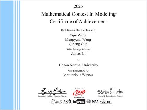 近日,2025年美国大学生数学建模竞赛成绩正式发布。我院2022级王一洁等三名同学组成的队伍荣获Meritorious Winner(国际一等奖,即M奖)。 美国大学生数学建模竞赛(MCM/ICM)是由美国数学及其应用联合会主办的极具影响力的国际性数学建模竞赛,赛题类型丰富,在世界范围内享有盛誉。为助力学生备赛,学院搭建科创平台,邀请教授开展系列讲座,为参赛队伍提供一对一教师指导,保障学生胜利完成比赛。备赛期间,参赛学生不畏艰辛,利用课余时间钻研复杂模型,面对难题不气馁,主动请教老师和学长,在挫折中磨砺成长,最终取得优异成绩。 近年来,学院注重培养学生创新意识与实践技能,营造良好学习氛围,推动学科竞赛发展。今后,学院将持续深化实践与理论融合,以学科竞赛为驱动,紧扣国家战略与行业发展需求,助力学生提升逻辑思辨与协作能力,致力于培育既具创新实践能力,又有国际视野的数学专业人才。 (数学与统计学院 王歌曼 韩滢玉/文) |