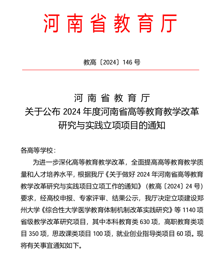 5月15日,河南省教育厅发布《关于公布2024年度河南省高等教育教学改革研究与实践立项项目的通知》(教高〔2024〕146号),依托我院申报的重大项目《职普融通、产教融合、科教融汇:地方高校新型现代产业学院建设研究与实践》获批。