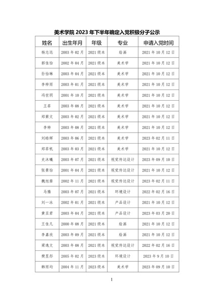 美术学院2023年下半年确定入党积极分子公示