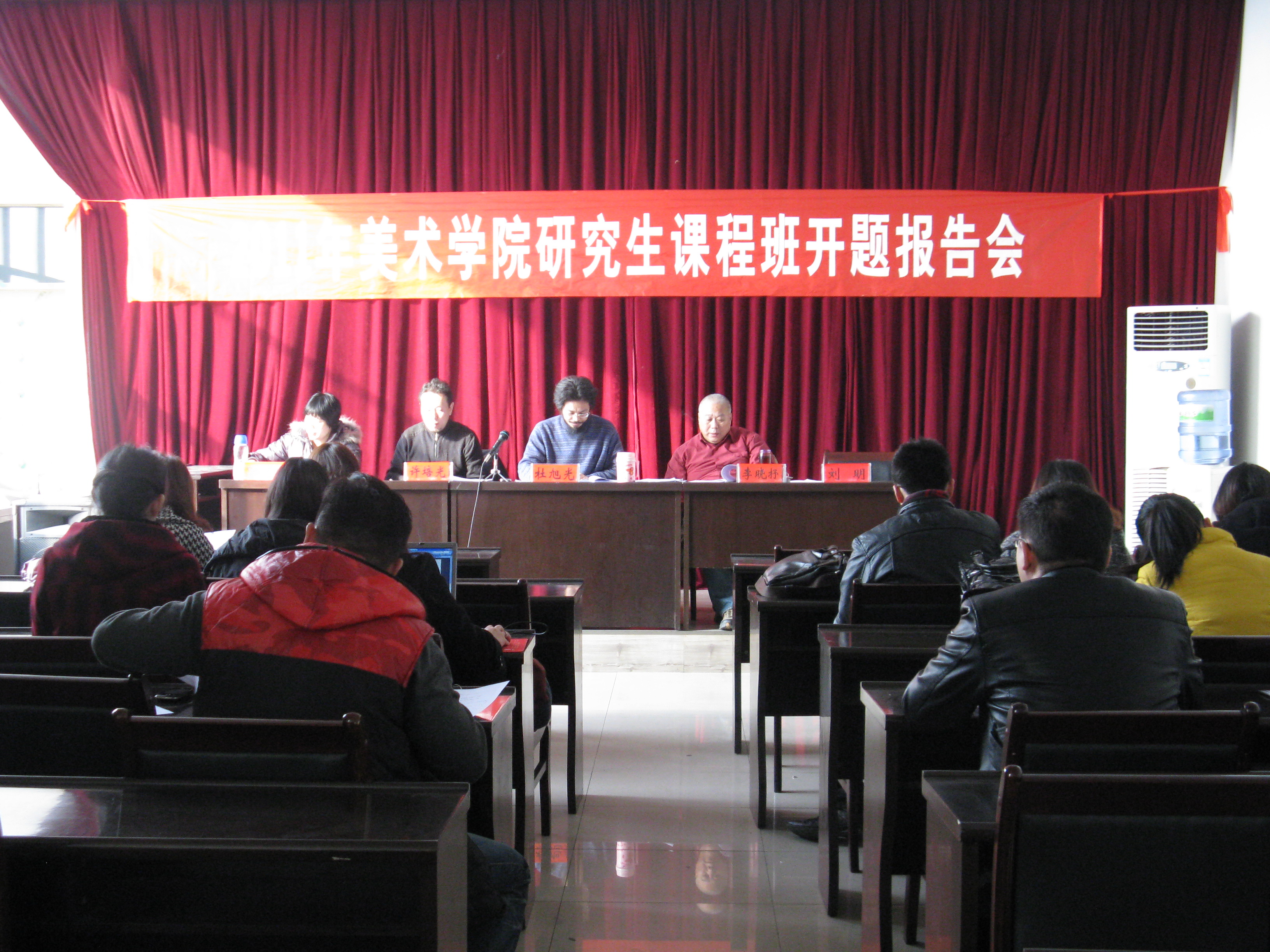 2011年11月19日,美术学院2011年下半年研究生课程班开题报告会拉开帷幕。开题报告会是研究生培养阶段的重要环节,是学位论文选题论证环节。本次研究生课程班开题报告会分为三个会场同时进行。开题委员由张建伟、赵运虎、李新生、唐亚、赵焕光、杜旭光、许培光、李晓抒、酒路、刘凤山、陈巍、牛向阳、郑胜利、王伟、吕瑛、刘明等老师组成。 报告会中,老师们针对每位学员的论文及其研究方向都进行了专门的指导,对学员的论文纲要严格要求的同时,用独到的眼光和角度与学员进行了探讨并提出了建设性的修改意见。最后30位学员顺利通过,17位同学的选题需要修改后重新开题。