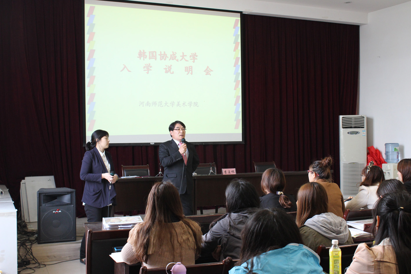 随后,韩国协成大学计划处处长李贞根教授、文智惠女士在美术学院学术报告厅举行了“韩国协成大学入学说明会”,着重就该校学习环境,学习氛围,以及入学要求等问题进行了细致介绍。为有意向赴韩留学的同学答疑解惑,并欢迎同学们前往该校就读研究生。