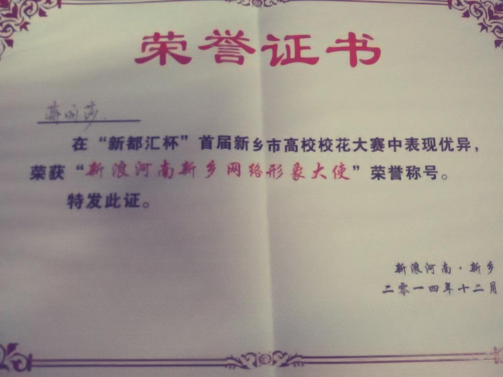 热烈祝贺我院研究生蒋丽莎同学在“新都汇杯·首届新乡高校校花大赛”中获得冠军