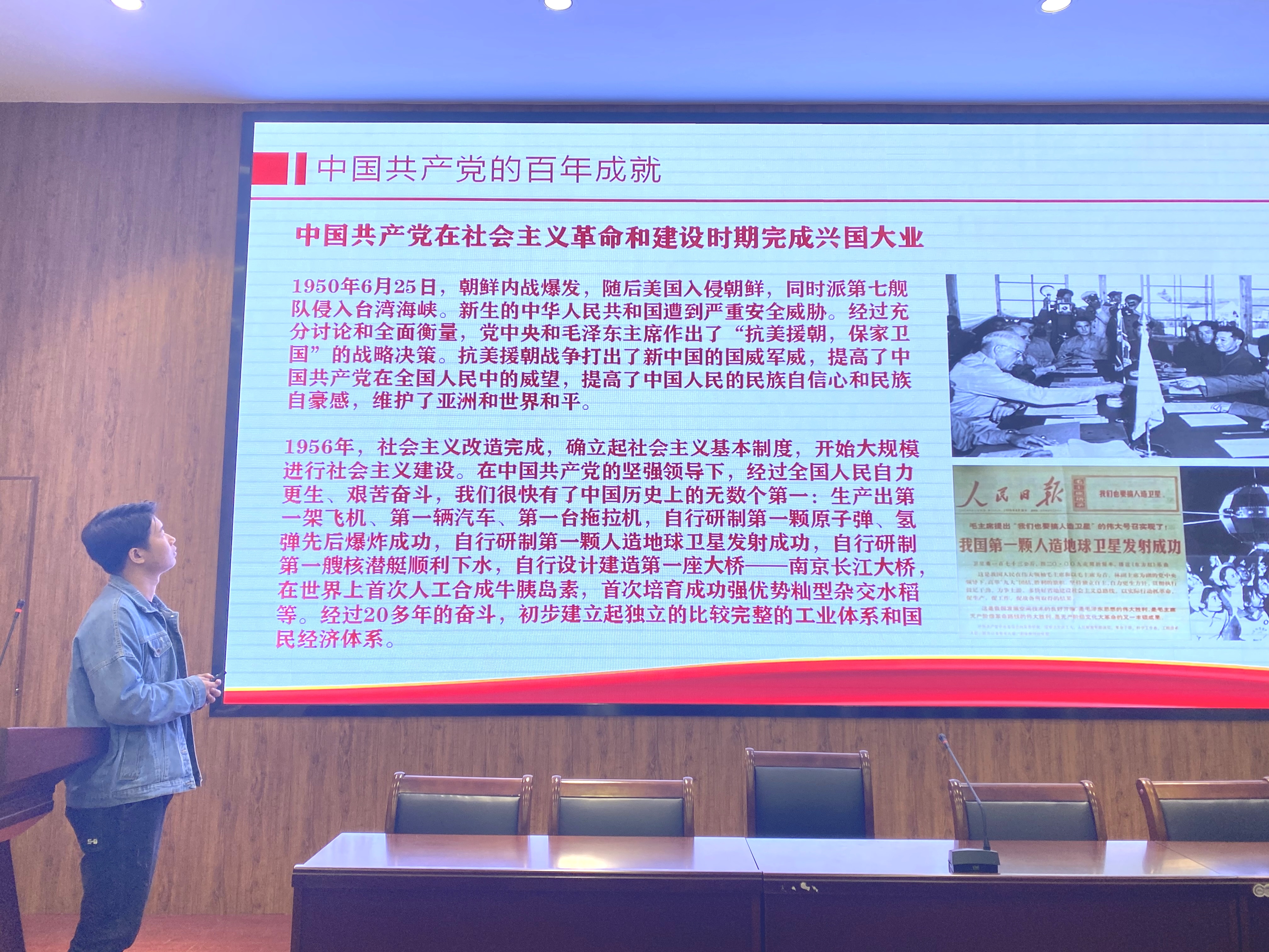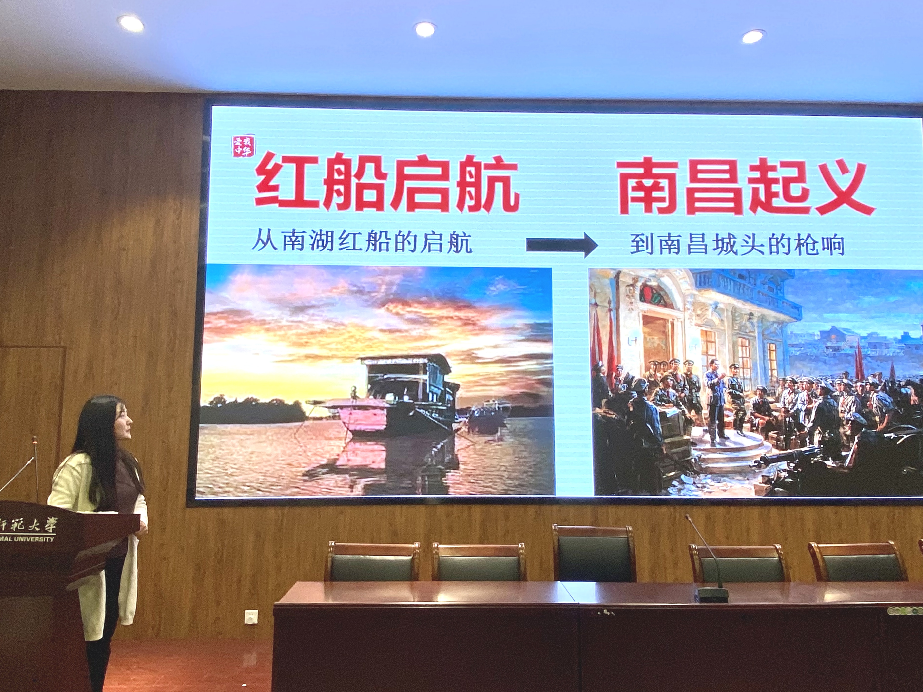 此次大赛有10组选手,共16人参加。大赛伊始,主持人介绍了比赛的流程和规则,参赛选手需要围绕“百年征程 ‘豫’你同行”这一主题,依次进行5分钟以内的PPT主题讲解。比赛正式开始,参赛选手逐一地上台对自己的参赛作品进行展示。选手们的PPT内容选材新颖、形式丰富,并且其慷慨激昂、精彩绝伦的讲解,深深地感染到了在场评委。其中,2018级美术学专业邵晶晶的作品内容要点突出,版面独特美观,讲演自然流畅,获得在场评委的一致好评;2018级美术学专业张旦丁详细讲述了中国共产党的百年征程,其作品新颖别致、主题立意明确。评委针对选手们的情况进行点评总结。