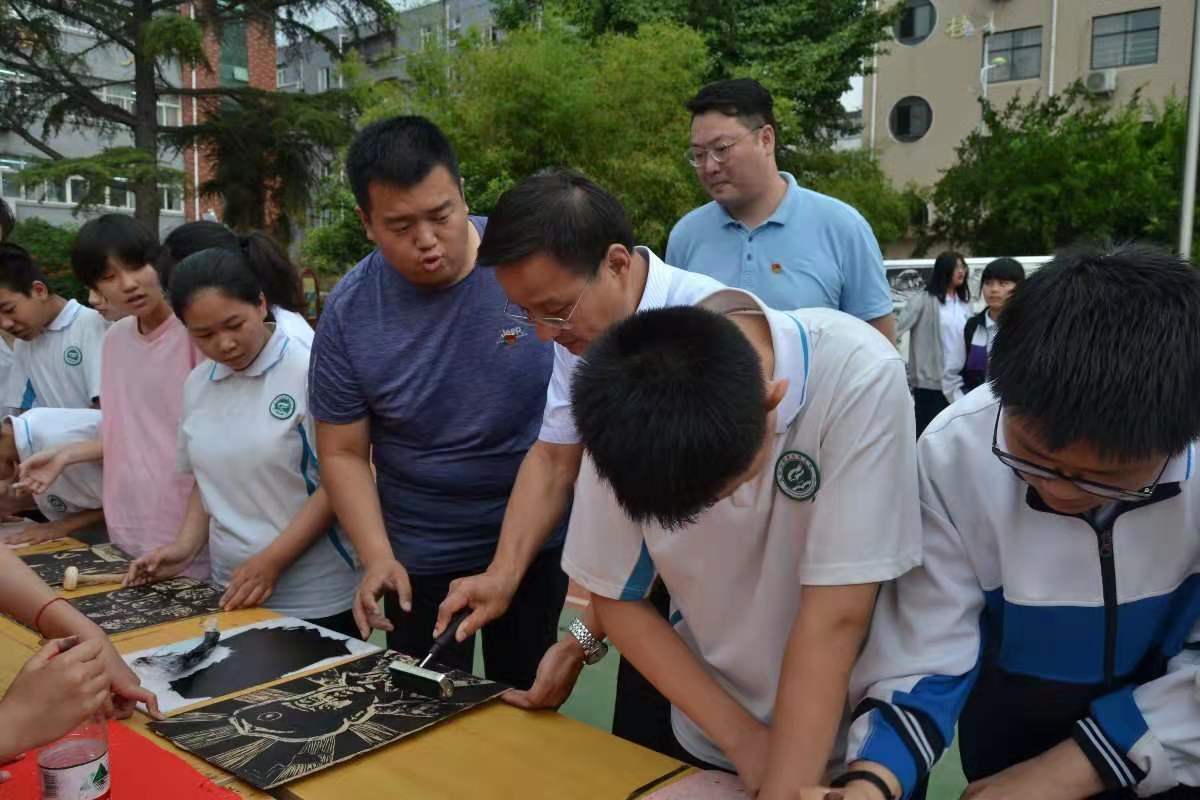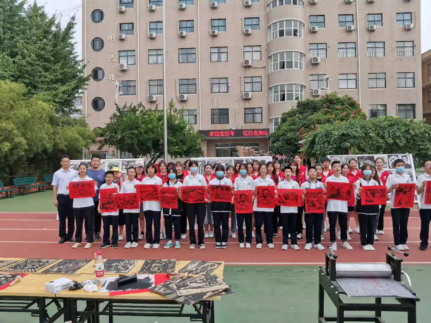 6月28日,美术学院在新乡市铁路高级中学举办“百幅红色版画进校园”党史学习教育展示活动。新乡市铁路高级中学校长李志杰、美术学院党委副书记单一飞、党员教师徐宪出席活动,学院学生党员志愿服务队携百幅红色主题版画参加活动。