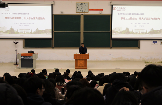 11月9日晚,校党委常委、纪委书记、监察专员张尚字教授在文昌楼102教室为美术学院新生讲授思想政治教育课。学院相关负责人及2021级本科生、研究生新生和专升本学生参与了本次活动。