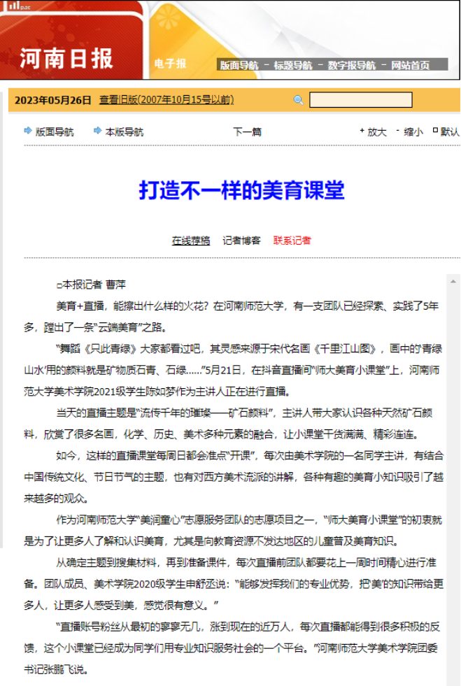 5月26日,河南日报报道我院“美润童心”志愿服务队开展的“美育小课堂”活动。