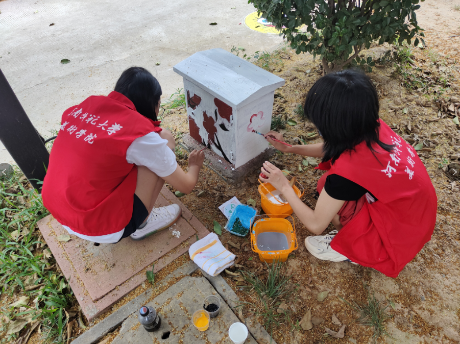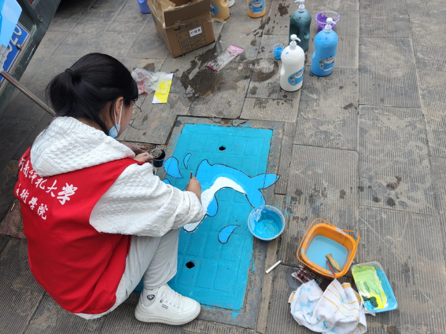 活动前,学院团委负责人与社区负责人协商绘画等具体事宜。在社区大家根据涂鸦内容后进行分组,认真专注地为井盖进行清洁,为涂鸦进行起型、刷底色、填充颜色,认真细致的在井盖上勾勒出精美的图案。志愿者们克服天气因素,长时间蹲着或盘坐着的姿势进行绘画,丝毫不影响大家的志愿服务热情。