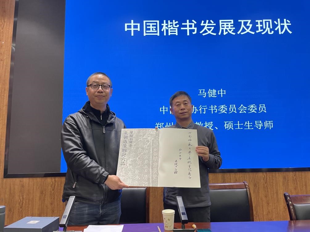 开班仪式后,马健中教授在其主编的《北朝造像题记六品》上亲笔题字并赠与美术学院,陈巍院长表示衷心感谢并回赠由美术学院陶艺工作室制作的陶艺月饼,仪式结束后马健中教授围绕楷书的发展历程,为学员们带来《图说书法》课程。