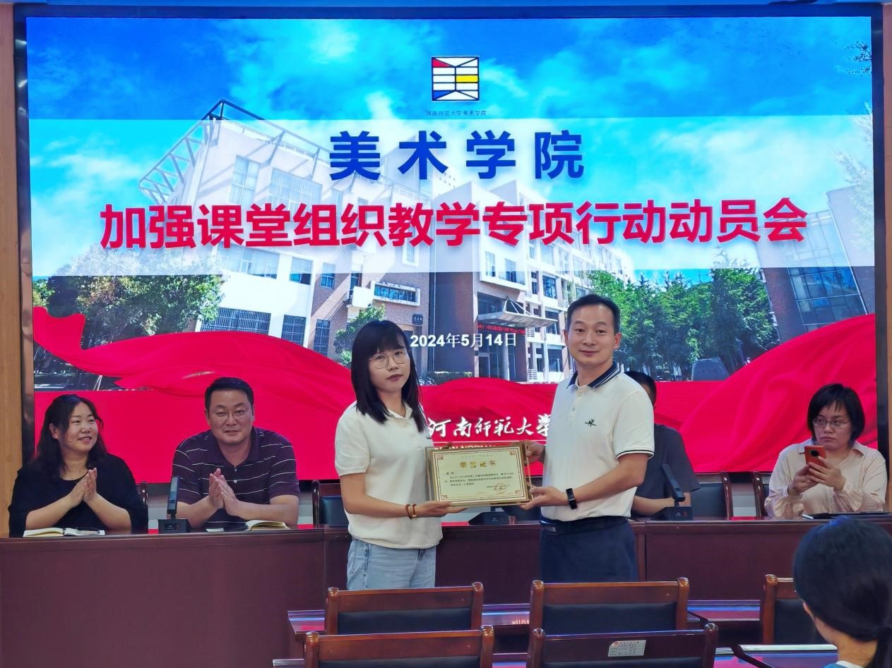 会上,学院党委书记华锋首先强调了高质量本科课堂教学质量文化建设的重要意义,指出教师对待课堂教学要形成规范意识、质量意识与敬畏意识,希望大家能够高度重视此次教学专项行动的领悟与落实。王霄深入解读了教务处《关于加强教师课堂组织教学专项行动的工作方案》与《美术学院加强课堂组织教学专项行动工作实施细则》文件内容,并结合学院教学特点与现存问题,为下一步教师加强课堂组织教学提出了具体要求。随后,华锋为李琪老师颁发我校“本科教育教学优秀课例”荣誉证书,李琪结合自身课程案例分享了教学经验与心得。
