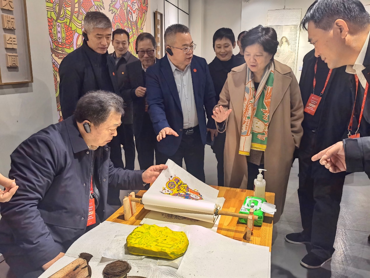 郝芳华一行首先参观了“文心涵濡——伟德官网下载苹果版美育成果展”。此次展览的内容分别来自我校近年来美育活动成果、美术学院近三年毕业创作展的留校作品与部分课程文创作品,涵盖了美术学、绘画、视觉传达设计、环境设计、产品设计5个本科专业,包含国画、油画、水粉水彩、综合材料、艺术设计等多种类型。美术学院院长陈巍向专家们进行了详细的讲解,重点汇报了近年来我校开展美育浸润工作取得的一系列成果及特色成效。美术学院美术馆作为我校美育实践教育平台,在人才培养、艺术教育、学术研究等方面发挥了关键作用。专家组随后进行了木版年画制作体验活动,河南省非物质文化遗产代表性传承人、伟德官网下载苹果版美术学院兼职教授张廷旭为专家进行了现场介绍与示范。我院木版年画工坊融教学、创作、展示为一体,充分发挥专业特色,积极传承和弘扬中华优秀传统文化,并获批“河南省首批中华优秀传统文化传承基地”“河南省首批学校体育美育浸润行动计划”,有效推进了中华传统优秀文化在美育浸润行动中的协同推进。