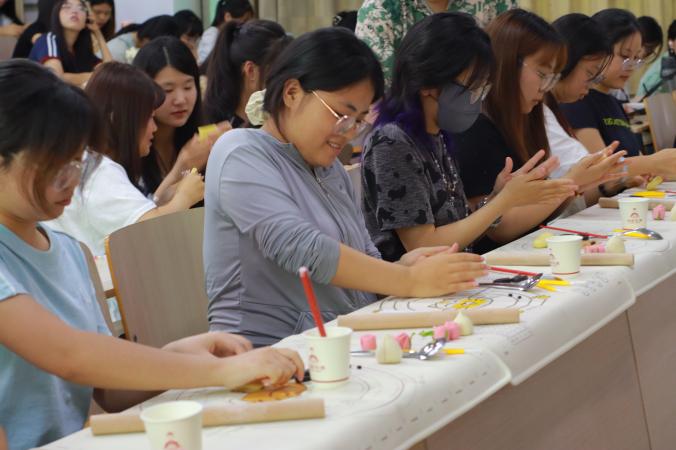 课堂教学活动中,梁莉老师首先系统讲解了花馍的历史渊源、制作工艺及其在传统节日和民俗活动中的重要文化价值。随后,其团队带领同学们进行现场实操,指导学生运用彩色面团和工具,亲手制作玫瑰花、寿桃、黄河大鲤鱼等造型生动的花馍作品。传承人娴熟的技艺令普通面团焕发生机,师生们沉浸于创作过程,课堂氛围热烈。课程尾声,梁老师还将亲手制作的玫瑰花馍赠予学生分享。
