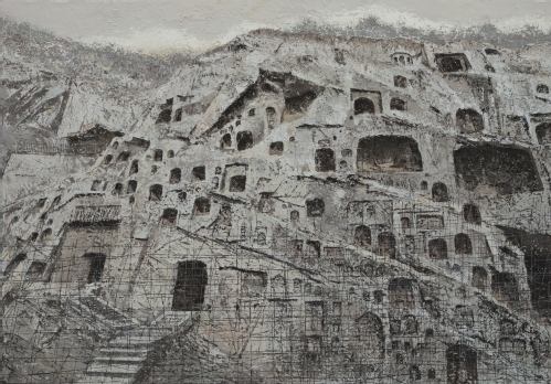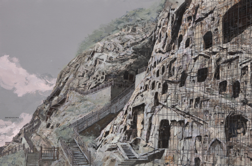 《为龙门石窟搭建脚手架》 布面油画 89cm x 116cm 2017