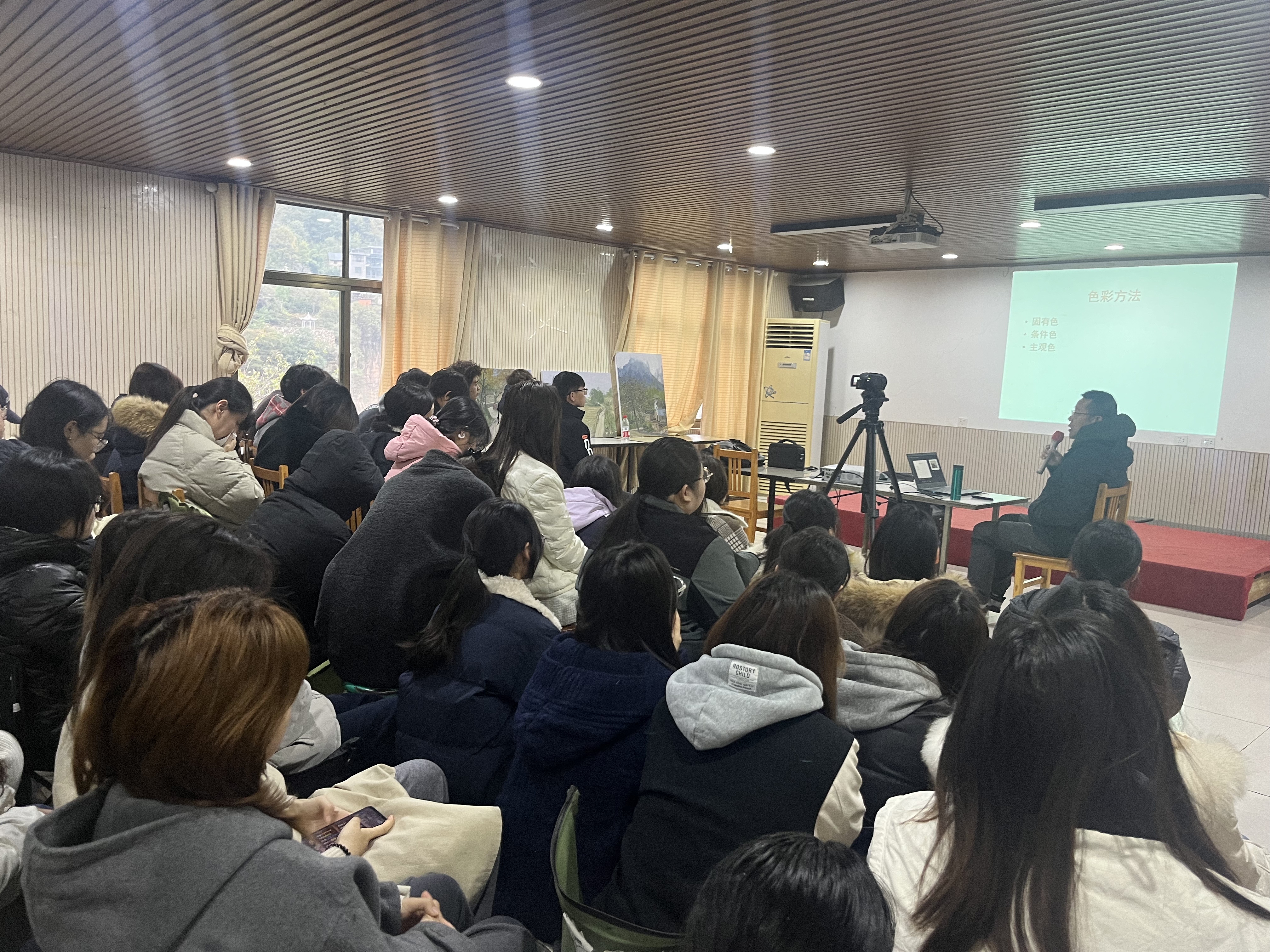 活动伊始,朱沙教授以昆山村的自然与人文景观为切入点,结合环境设计专业特色,从“色彩捕捉”“空间构图”“情感表达” 三个维度展开讲解。他借助实地摄影素材引导团员感知村巷肌理,结合青砖灰瓦、山间薄雾、田间作物等实景,现场示范乡村场景的光影观察方法,讲解如何用水彩笔触还原乡土建筑的质感;同时点明“环境设计是空间塑造,更是地域文化的传承,写生是理解‘设计源于生活’的第一步”。团员们边记要点边互动,围绕“水彩如何表现乡村环境层次”“写生元素如何融入设计作业”等问题交流,现场学风浓厚。专题讲解后,团员们以小组为单位深入村落开展写生实践。大家携带画板、颜料深入昆山村各处,有的聚焦村口古桥的斑驳木纹,有的描绘山坡梯田的错落线条,有的捕捉农家院落的生活气息。班级团支书积极组织团员分享创作思路,鼓励大家将环境设计专业的空间思维融入写生创作之中,尝试用画笔挖掘昆山村的生态之美与文化之韵,团员们在实践中逐渐找到观察、思考、创作的专业学习节奏。