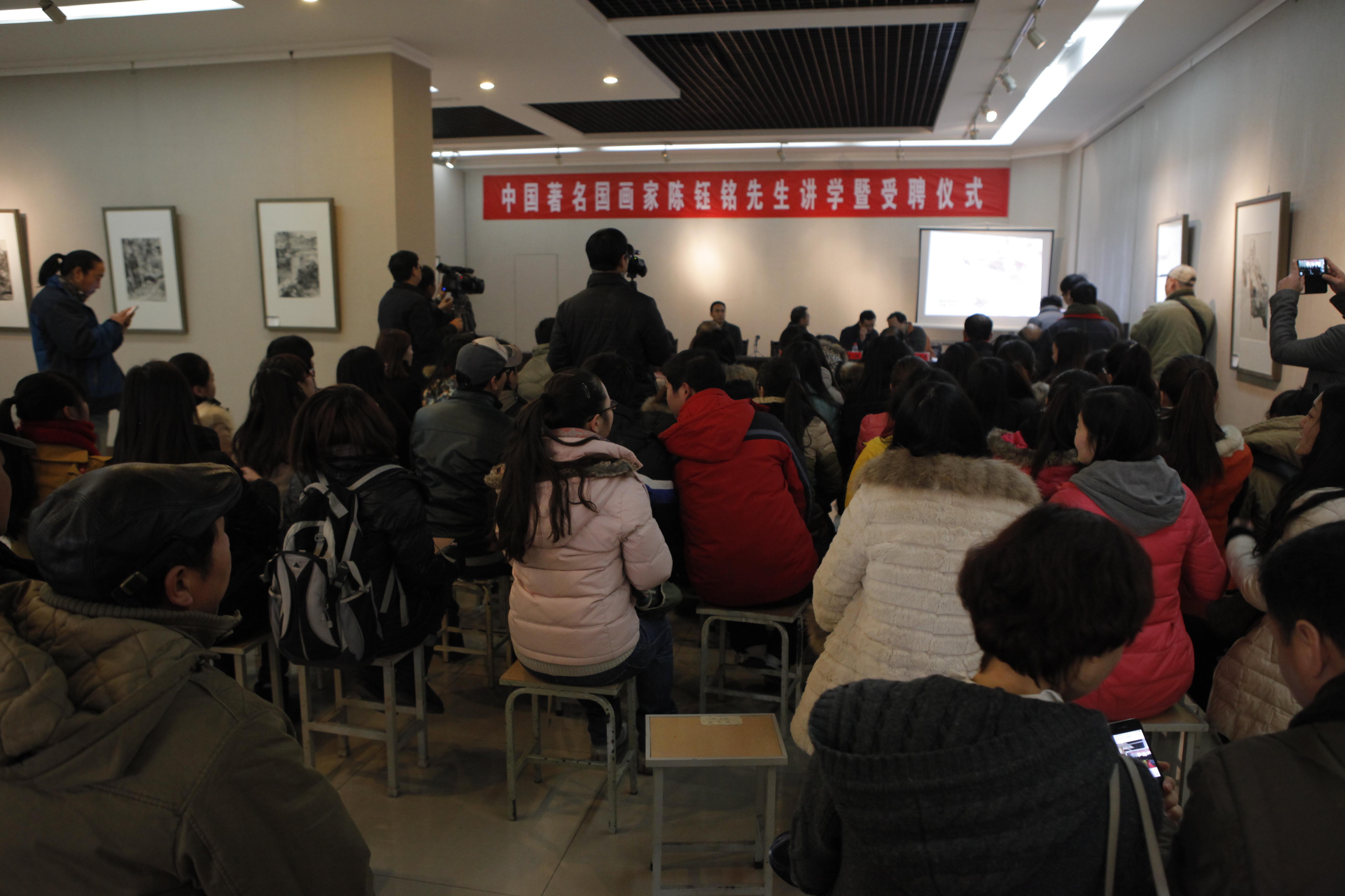 受聘仪式上,副校长杨林代表学校致辞并为陈钰铭先生颁发了聘任证书。美术学院院长张建伟介绍了陈钰铭先生的艺术经历和成就。仪式结束后,陈钰铭先生为美术学院师生作学术讲座,讲座从对水墨人物画的认识及观点入题,将作品展览、课堂讲授与现场示范相结合,为广大师生提供了一次难得的学习机会。