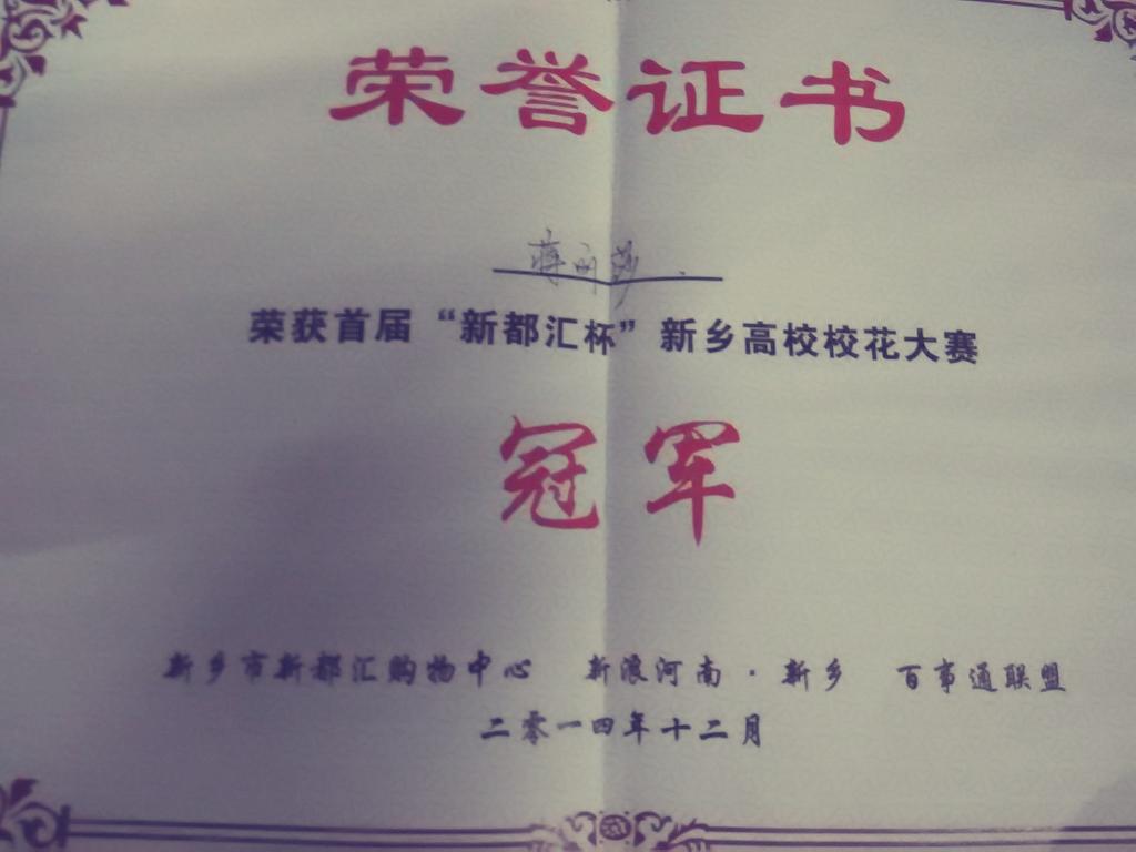 热烈祝贺我院研究生蒋丽莎同学在“新都汇杯·首届新乡高校校花大赛”中获得冠军