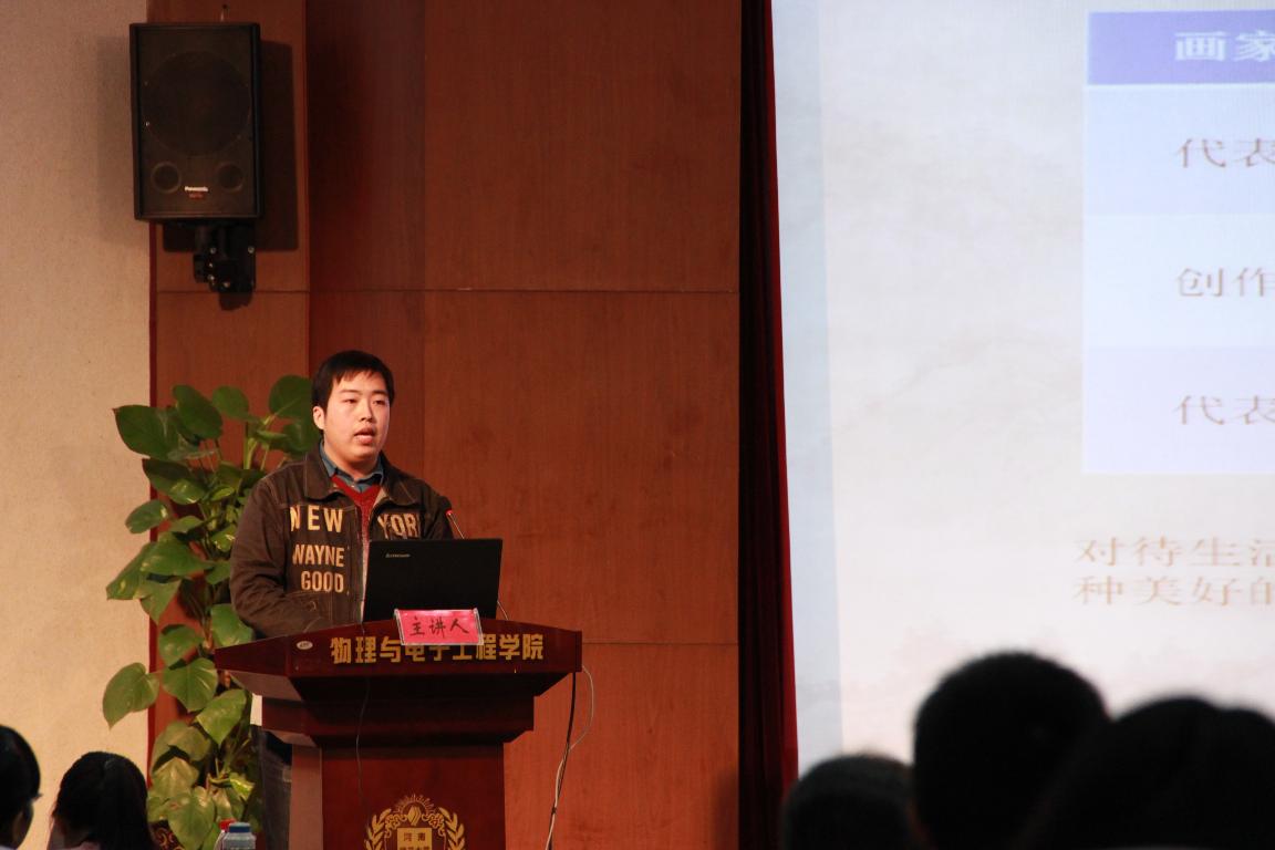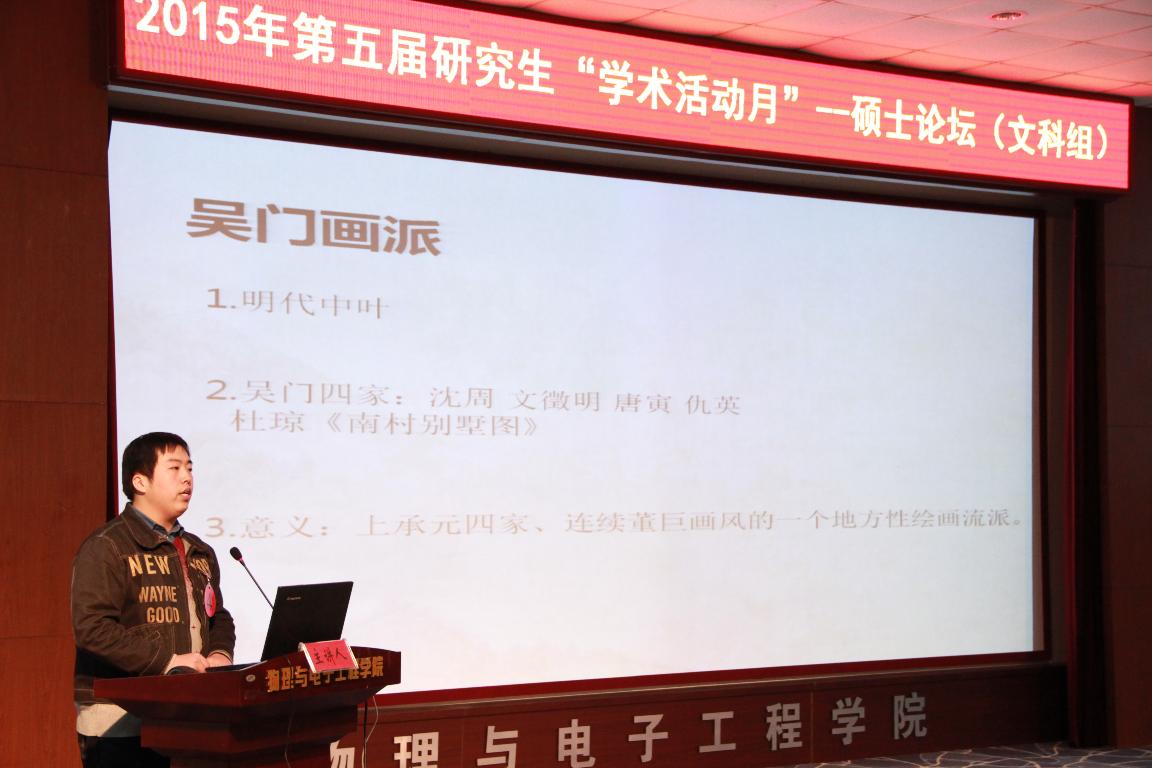 硕博论坛是我校第五届研究生“学术活动月”的重要活动,自启动以来我院高度重视,经过初期选拔之后确定2014级研究生张鹏飞同学为我院参赛人选,在经过充分准备和老师精心指导下,张鹏飞同学以《浅谈吴门画派关于现实生活创作题材的艺术特色》为题进行了论述,以清晰严谨的逻辑思路和流畅生动的语言得到了评委老师的认可和好评,不负众望从众位参赛者中脱颖而出并取得了文科组一等奖的优异成绩。