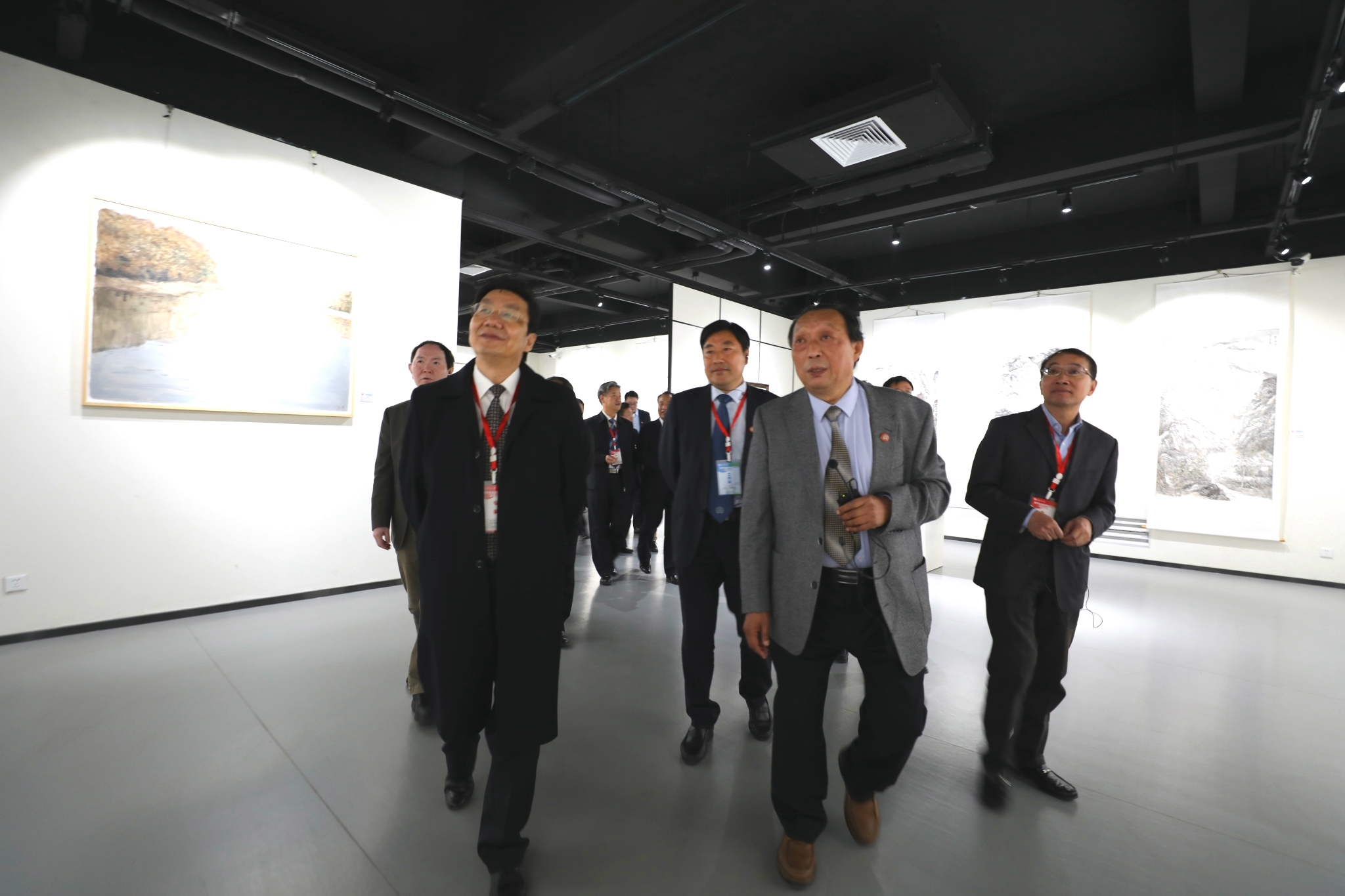 在考察中,张建伟向专家们介绍了美术学院的办学历史,并对学院院石的历史渊源和文化内涵做了风趣讲解,张院长对大学艺术教育与传统文化的传承方面的阐述受到专家们的一致赞同。美术馆正在展出的是“致敬改革开放40周年师生作品展”主题展览,作品形式多样,内容丰富,包含中国画、油画、艺术设计、雕塑、书法、装置和手工艺作品共计一百余幅,专家对展出作品的量多质优、艺术价值、创作手法、审美理念等方面表示充分的肯定。
