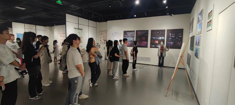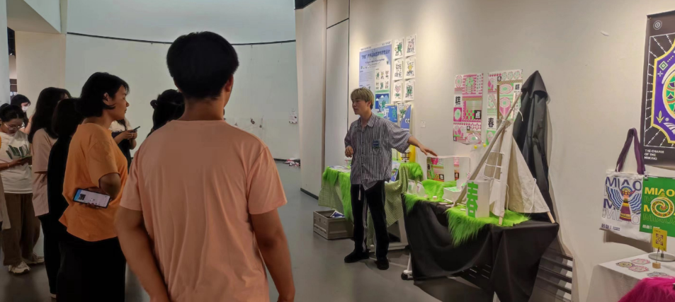 此次是以“物成”为主题的2023届本科设计类专业毕业作品展,由美术学院2020级油画专业梅勇昊,2022级美术专业候雨欣、赵胜楠、孔梦圆分批次进行、各有侧重,全方位多角度的从作品的主题到类别,从设计的理念到用途以及作品对观者、对社会产生的影响进行分析讲解。同学们跟随主讲人的脚步,认真倾听,部分同学主动与主讲人进行互动交流发表自己的看法,活动现场氛围融洽。活动结束,同学们对展出的作品赞不绝口,并和主讲人志愿者合影留念,展示了大学生们立足于学科,发挥志愿服务精神的形象。