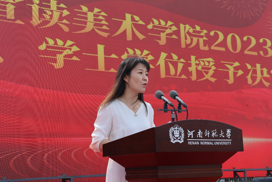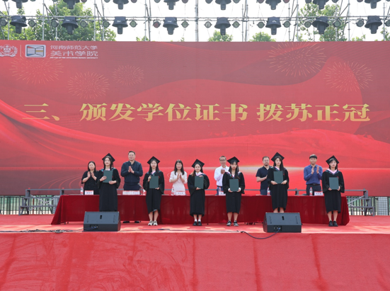 此次典礼在庄严的国歌声中拉开帷幕。仪式伊始,院党委书记孙红艳宣读《伟德官网下载苹果版美术学院2023届毕业生硕士、学士学位授予决定》,由院领导为毕业生代表颁授学位、拨苏正冠。之后研究生代表黄媛、本科生代表南甘霖与教师代表宋长江依次上台发言,言语抑扬顿挫,饱含真情。优秀校友代表、郑州大学新闻与传播学院副院长陈晓伟寄语同学,勉励大家牢记师大校训,传承师大精神,肩负师大荣辱,不负母校期盼。副院长王霄宣读伟德官网下载苹果版美术学院2023届毕业生优秀作品收藏名单,并由院领导为同学们颁发作品收藏证书。