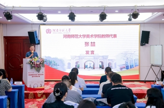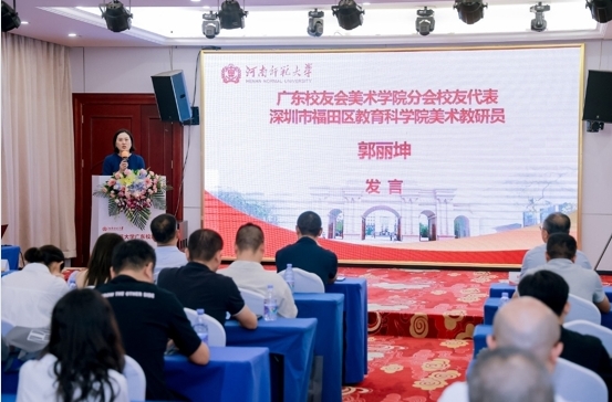 广东校友会美术学院分会校友代表,学院2002届校友,深圳市福田区教育科学院美术教研员郭丽坤发言。用她自身的经历和对美育事业的热爱,生动诠释了河师美院人的专业素养和教育情怀,她的发言充满了对母校、对美院、对校友的真挚情感,也表达了对分会未来的美好期待。