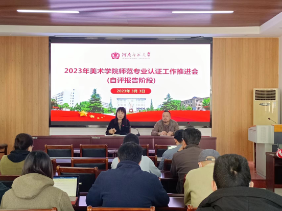为扎实推进我院师范类专业认证工作,切实做好认证的组织筹备,促进学院教育教学改革和教学的内涵式发展,进一步提高人才自主培养质量,圆满完成美术学专业的认证工作,按照我校近日下发的《师范类专业认证一体化推进工作方案》要求,结合学院实际,3月3日上午,在学院会议室召开了师范类专业认证工作部署会。学院党委书记孙红艳、全体科级干部及部分骨干教师参加会议,会议由副院长王霄主持。王霄首先介绍了我校当前师范类专业认证的整体进度与背景,重点对学院美术学专业认证现阶段的工作目标、组织机构与工作职责、具体分工、进度安排四个方面进行了说明与部署,指出美术学专业认证对学院的专业建设与人才培养具有极为重要的实践意义,学院全体师生要高度重视此项工作。接下来各小组要按照此次工作部署,在规定的时间节点内,高质量地完成自评报告的撰写,为通过二级认证做好充实保障。随后,孙红艳指出,师范类专业认证是今年学院的重点工作,需要大家全员参与,精诚合作、形成合力,以高度的责任心切实落实好各项分工。在今后的教育教学过程中坚持“以评促建、以评促改、以评促强”的师范类专业认证方针,坚持落实“以学生为中心,以产出为导向,持续改进”的认证工作理