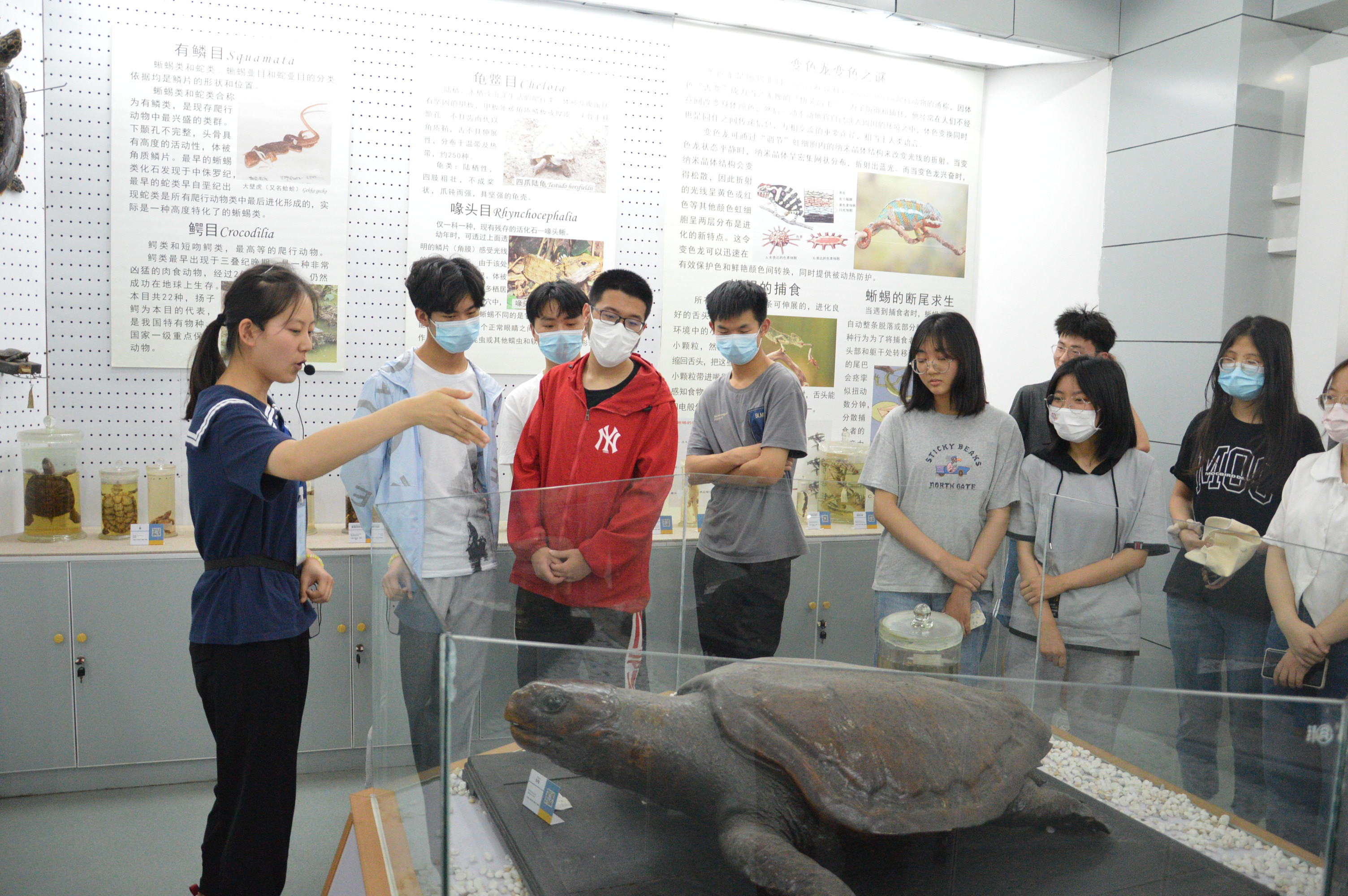 为深入学习贯彻习近平总书记在庆祝中国共青团成立百年大会上的重要讲话精神,积极响应“绿水青山就是金山银山”的生态理念,营造人与自然和谐共生的氛围,5月18日,美术学院、生命科学学院在学校生物标本馆联合举办“喜迎二十大 永远跟党走 奋进新征程”主题团日活动。校团委团委副书记杨上上及美术学院、生命科学学院团委负责人、辅导员代表及学生四十余人参加了本次团日活动。首先,讲解员介绍展馆情况,参观者对标本馆具有具体的认识。参观期间,讲解员结合馆内所陈列的生物标本以及展板,围绕生物标本的生存环境、体态特征、生态价值等多个方面展开生动形象地讲述,使此次活动充满科学性与趣味性。标本馆诸多珍贵的标本也大大激发了大家的学习热情,也迸发了不同学科之间交流学习的激情。杨上上对两个学院举办本次主题团日活动表示肯定,他表示团委要为广大学生搭建平台,使不同学科之间更多沟通交流,为学生之间的学习、科研、生活等方面提供更多的融合发展思路。此次活动,通过两个学院之间的联合活动,让同学们更好地了解自然,走进自然,深刻认识到人与自然和谐共生关系的重要性,同时也为不同学科之间加强交流提供了新的思路和方法。 (美术学院 张鹏飞 生命