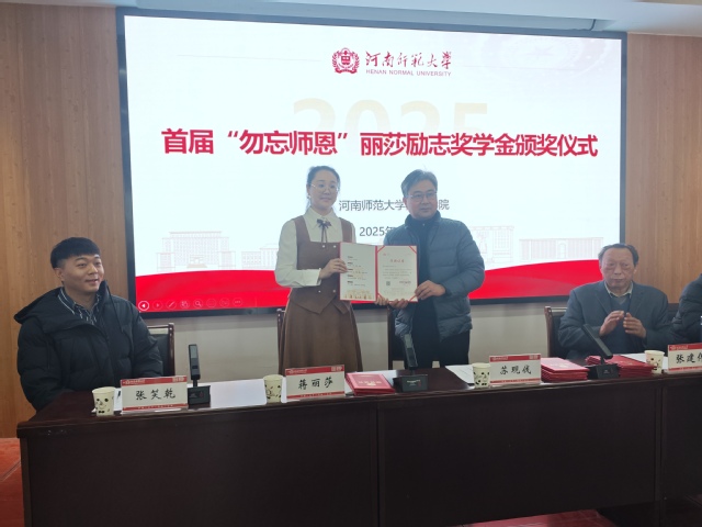1月8日上午,首届“勿忘师恩”丽莎励志奖学金颁奖仪式在美术学院会议室隆重举行。发展规划处处长、校友与基金工作办公室主任苏现伐,美术学院原院长张建伟,院长陈巍,奖学金捐赠人蒋丽莎女士以及获奖学生代表参加了本次颁奖仪式。仪式由副院长张笑乾主持。陈巍院长首先代表学院对蒋丽莎女士的捐赠善举表达了由衷的感谢,他表示,“勿忘师恩”丽莎励志奖学金是首个由我院校友捐赠设立的奖学金,用以奖励经济困难,品学兼优的研究生,不仅是我院学子心系师大的生动写照,更是我院多年来人才培养成效的集中体现。接下来,苏现伐处长代表学校向蒋丽莎女士颁发了捐赠证书,高度赞扬了她不忘恩师,回馈母校的善举,他表示校友会是连接校友与母校的桥梁,是传承学校精神、凝聚校友力量的重要平台。校友会在学校领导的高度重视和大力支持下,不断创新工作机制,拓宽服务领域,加强校友联络,取得了显著成效。最后,张建伟教授宣读了获奖学生名单并为他们颁发荣誉证书。他在随后的讲话中深情回顾了蒋丽莎校友在校期间的优异表现,勉励美院学子要以此为契机,不忘初心,砥砺前行,继续发扬“厚德博学,止于至善”的校训精神,保持对知识的渴望,对创新的追求,对社会的责任感,不断突