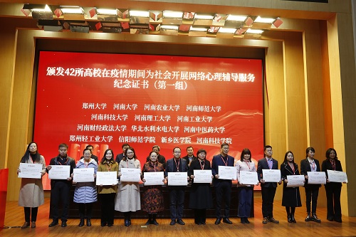 12月16-18日,河南省高校心理健康教育中心主任论坛召开。论坛开幕式上,中共河南省委高校工委、省教育厅为我校颁发纪念证书,表彰和肯定疫情期间我校开展的网络心理疏导服务工作。