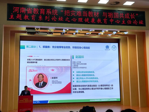 本次论坛是河南省教育系统“把灾难当教材 与祖国共成长”主题教育系列论坛之一,全省132所高校的心理健康教育中心主任参加。我校心理健康教育中心主任陈勇以“同心同力同行,育心育德育人”为题做论坛发言,从历史沿革与中心近况、工作实施与育人成效、努力方向与工作展望等三个方面,全面展示了疫情期间我校为社会开展网络心理辅导服务的工作瞬间以及我校心理工作战线为护佑师生心理健康的担当作为,受到省教育厅思政处和兄弟高校的高度评价。
