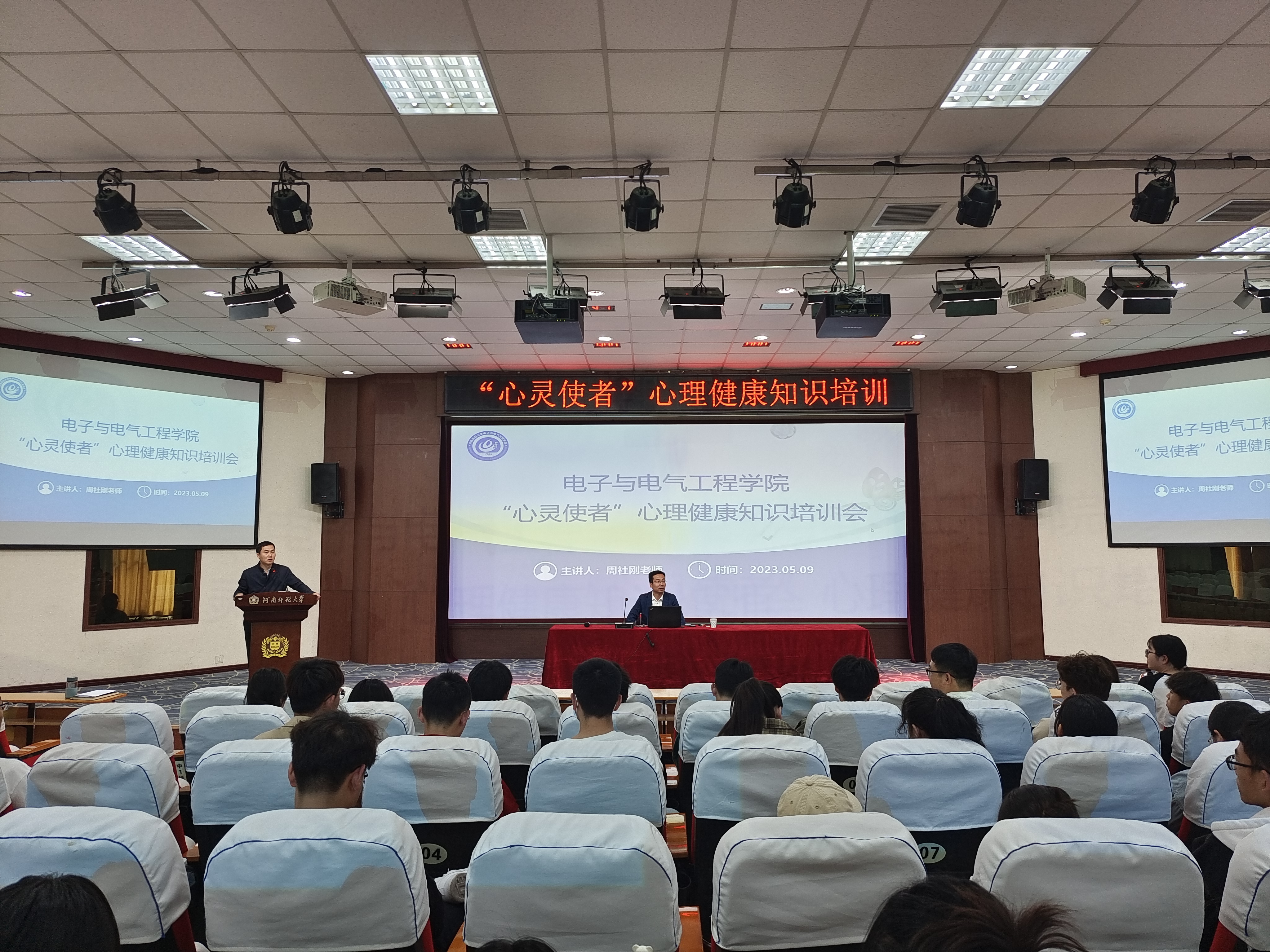 为进一步增强学院心理育人工作实效,充分发挥心理健康教育工作学生队伍力量,5月9日下午,电子与电气工程学院在物理北楼报告厅举办“心灵使者”心理健康知识培训会,邀请党委学生工作部副部长、学生中心副主任周社刚作主讲嘉宾。会议由电子与电气工程学院党委副书记邓晓刚主持,学院各年级心理委员、宿舍长参加培训。