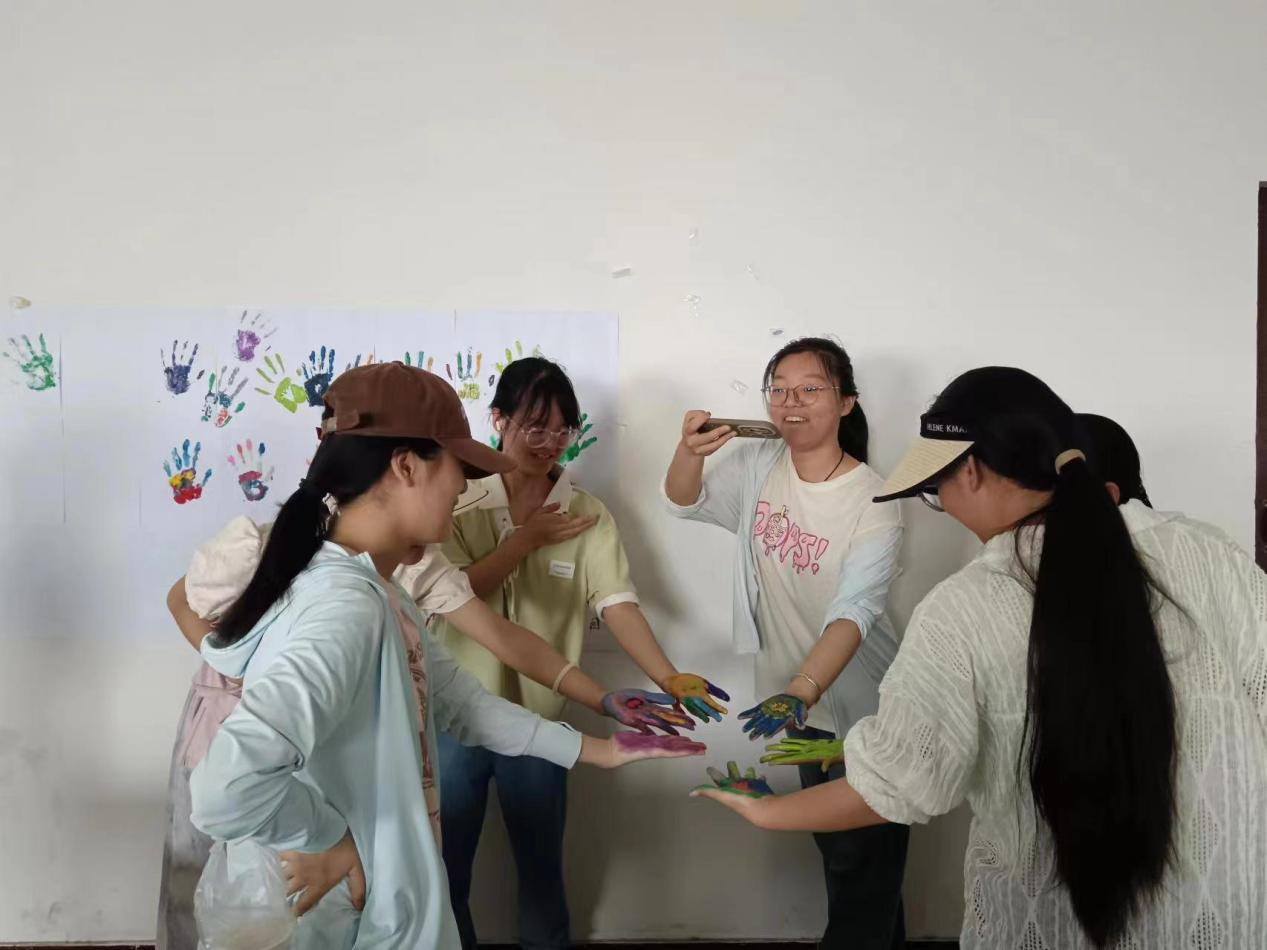 活动现场,同学们沉浸在绘画石膏娃娃和印手掌的欢乐氛围中。在石膏娃娃的彩绘活动中,同学们尽情想象,天马行空,将内心五彩斑斓的世界涂在石膏娃娃上,用丰富多彩的颜料和细腻的画笔赋予其生命,在石膏娃娃的身体上绘制出独属自己的独特风格和故事。在活动结束后,各小组成员共同展示创意作品,讲述创作理念,并拍照打卡,将美好瞬间记录下来。在我的生命色彩表达环节中,同学们结合个人想法,将自己的手掌涂满喜欢的颜色,与好朋友一同将手掌印在宣传墙上,并写上自己的名字,拍站留念,留下属于他们的美好回忆,也感受来自他人的温暖和力量。