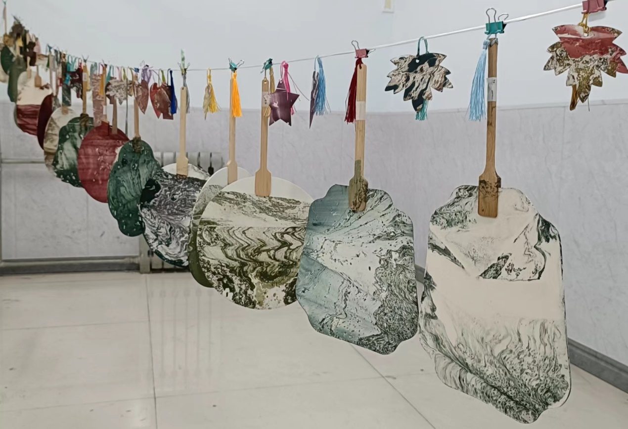 扇舞丹青绘古风,墨染芳华醉流年。活动伊始,活动负责人为同学们介绍了漆器的历史发展与漂漆扇的制作技巧,展示了制作漆扇的花式手法。接着,在负责人的讲解带领下,同学们开始跃跃欲试,纷纷调漆,不断尝试着不同的配色以及手法。彩漆滴入水中,随着水流的搅动变换出不同的图案,将团扇缓缓放入水中,大漆的色彩附着在扇面上,穿插交错,流云变换,精致演绎了漆扇的诗情画意。随着时间推移,一幅幅精致美丽的漆扇作品逐渐呈现在大家面前。每一把漆扇都独一无二,展示着制作者独特鲜明的审美风格,同时也散发着中国传统漆艺的魅力与旺盛生命力。活动结束后同学们纷纷表示,通过手工制作漆扇,不仅锻炼了自己的动手能力和创造力,更重要的是,让他们在繁忙的工作和学习之余,找到了一种放松心灵、舒缓压力的有效方式。