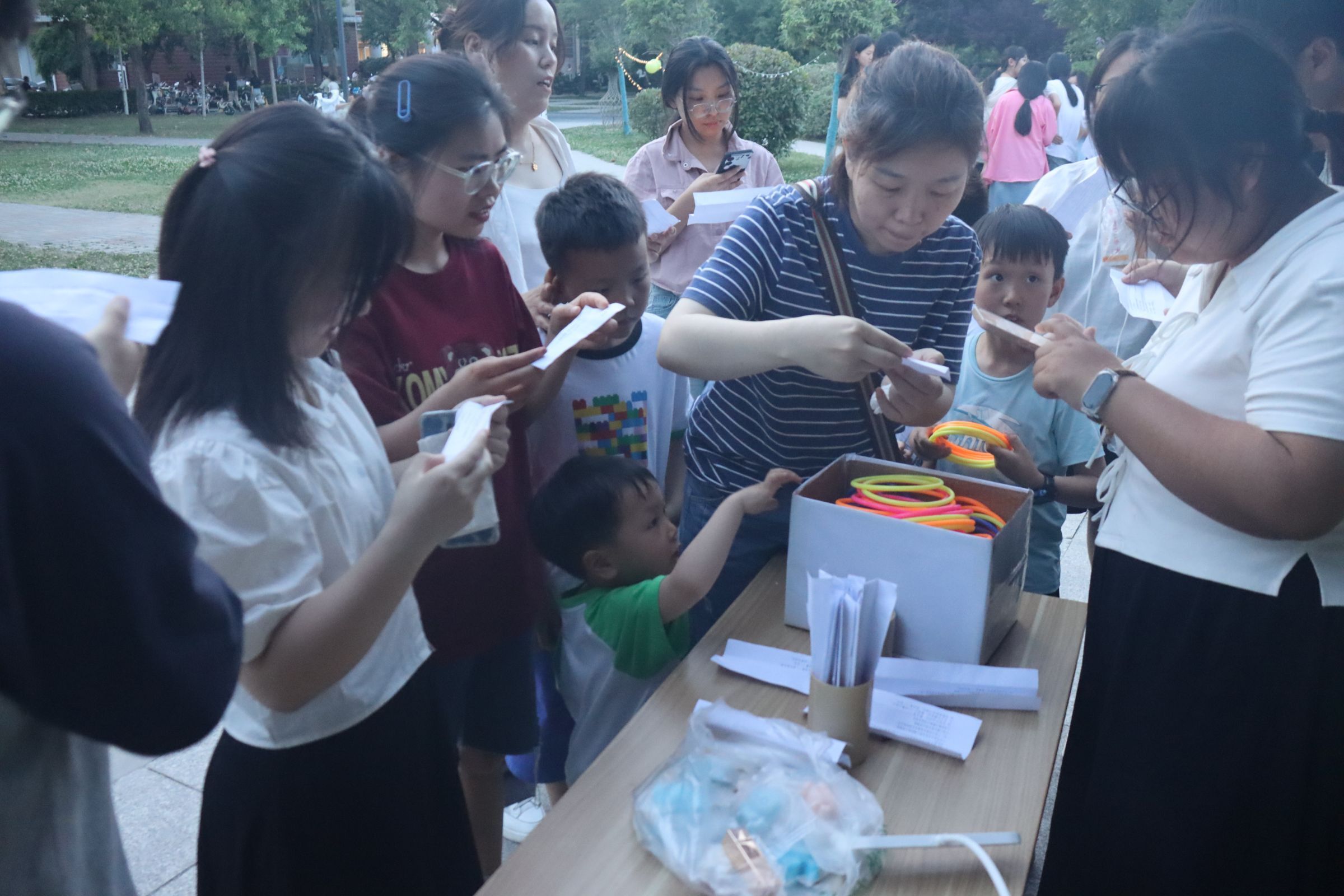 夕阳西下,华灯初上。活动在《我相信》的歌声中拉开帷幕。现场设置“环梦成真”、套圈“声动旋律”点歌台、“心语传情”信箱投稿等9个活动摊位,涉及情感传递、团队合作、创意手作等多个方面。“环梦成真”环节巧妙地将心理健康知识、防电信诈骗、用电须知等安全常识融入活动之中,同学们通过完成一定数量的题目获取套圈,将自己心仪的奖励收入囊中。“珠光宝气”手工串珠小工坊吸引了大量同学驻足,完成一定难度的动作即可得到相应物品奖励。不少同学离开时手上多了闪闪发光的手串,心里得到了很大的满足感和获得感。“心语传情”信箱前,老师和同学们纷纷执笔写下对远方亲朋好友的思念和祝福,让大家学会爱,表达爱,传递爱。整个游园会现场妙趣横生,精彩纷呈,既有参与活动的乐趣,又充盈着收获奖品的欢乐。