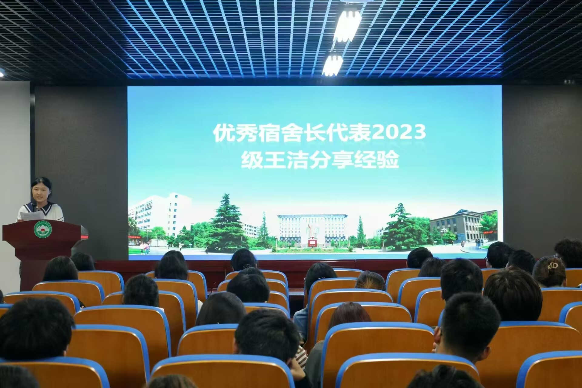 任洁以《宿舍长的武功秘籍》为题,为同学们进行了一场生动有趣的培训。会议伊始,任洁向到场宿舍长讲解宿舍长的定位与岗位职责,强调了宿舍长在宿舍纪律、安全、人际氛围、心理健康等方面的重要性,为宿舍长传授了宿舍版“葵花宝典”“降电十八掌”“火眼金睛”“团建大法”。她通过生动有趣的案例,详细为同学们讲解了宿舍纪律管理、用电管理、心理问题识别和营造良好人际氛围的实用性技巧。随后,2023级优秀宿舍长王洁分享宿舍管理经验。她强调了“尊重”和“团结”在宿舍管理中的重要性,分享了她在宿舍卫生管理、营造良好宿舍学习氛围等方面的具体做法,使大家认识到宿舍的管理方法可以更多样化,开拓了大家的思路,为之后大家开展宿舍管理工作提供了优秀的借鉴模板。最后,在提问答疑环节中,同学们积极提出关于宿舍管理中较为棘手的问题,王洁针对问题进行了具体分析并做出了详细耐心的解答。