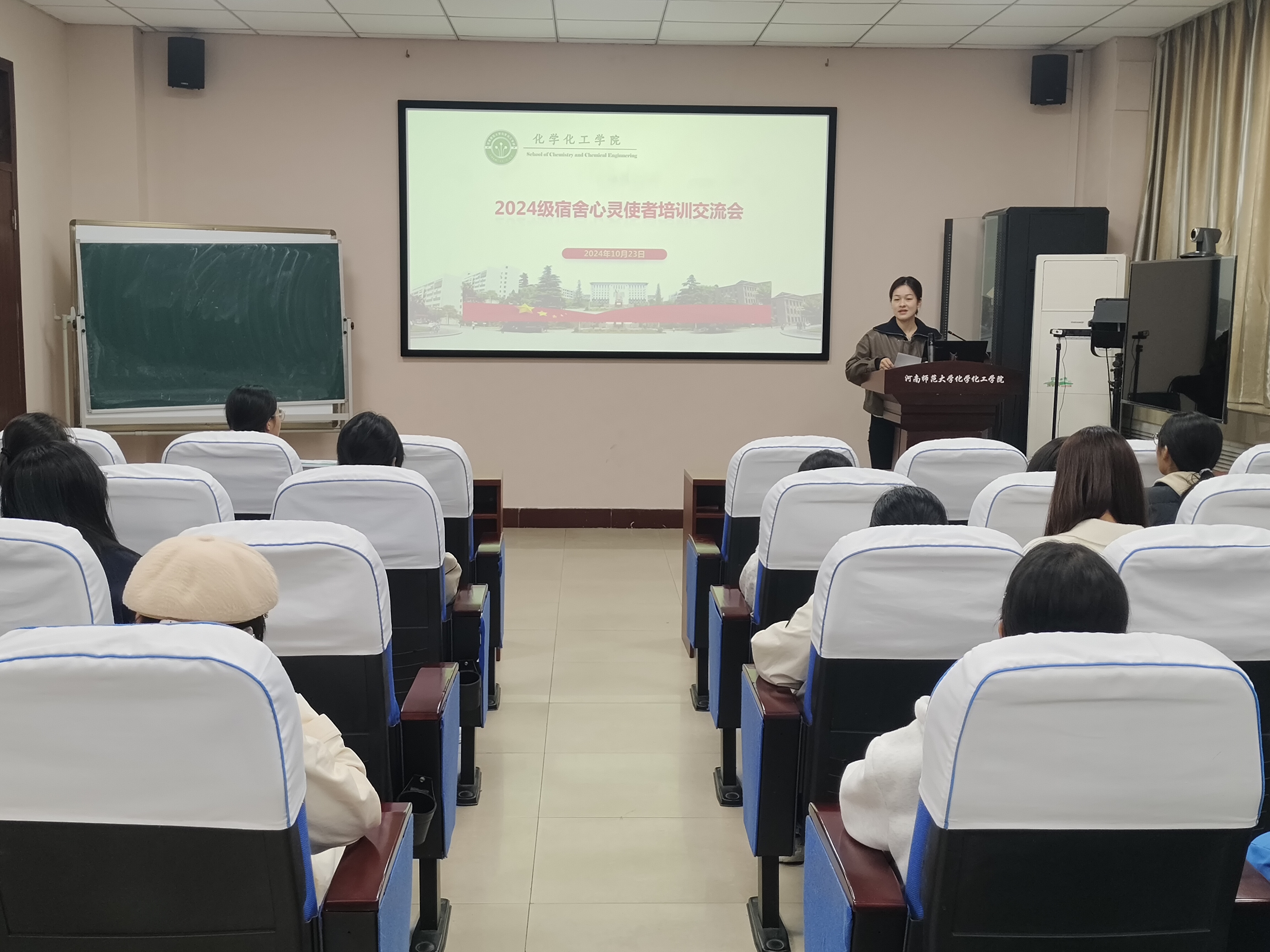为进一步提升心理健康教育服务水平,增强宿舍管理的针对性和实效性,10月23日下午,化学化工学院院在化学北楼N102会议室开展2024级宿舍心灵使者培训交流会。此次会议由2024级本科生辅导员罗睿睿老师主讲,2024级全体宿舍长参与。