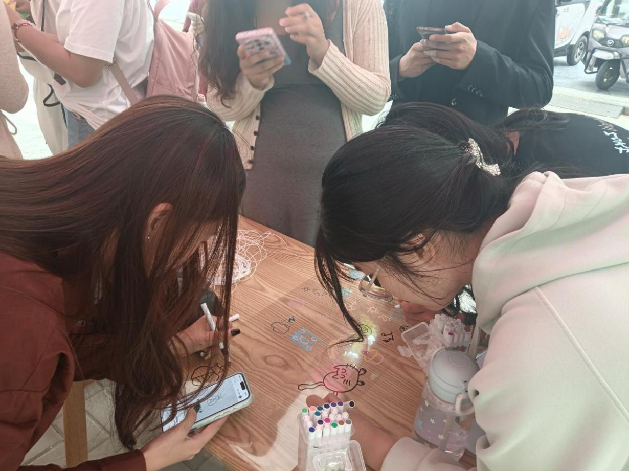 活动现场,色彩斑斓的摊位迅速吸引了过往同学的目光。带着好奇与期待,人群渐渐聚拢并参与其中。有的同学手持画笔悬停良久,目光中透露出期待与谨慎,似在积蓄勇气;有的同学凝视着透明的膜面陷入沉思,眉头微锁,仿佛要在无声中寻找情绪表达的出口;指导者们带着温暖的笑意送上“定心丸”:“在这里,艺术没有标准答案,更无需技巧的束缚。请相信,每一笔随心而动的色彩都是珍贵的自我对话,每一幅源自内心的作品都独一无二。尽情释放,大胆去画吧!”试探性的笔触轻盈落下,划出第一道自由的线条,参与者们完全沉入创作的河流,画笔成为了心声的代言,将无形的情绪与深藏的记忆,转化为眼前流动的色彩图景。一位完成创作的同学注视着光影在自己作品上跳跃,由衷分享道,“看着颜料在薄膜上流动、交融,好像心里堵着的那块东西也一点点溶解了。很多平时说不出来、甚至理不清楚的情绪,竟然自然而然地变成了画上的样子。这种释放感,难以言喻却无比真实。”