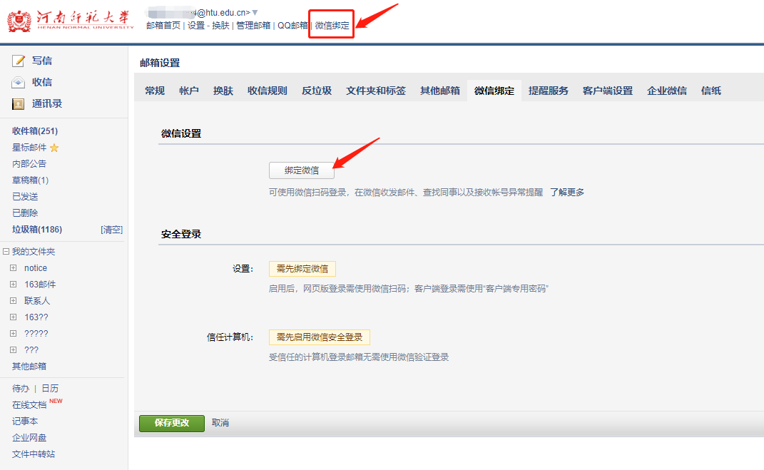 第二步:在个人邮箱中,点击“微信绑定”,开启“安全登录 ”。